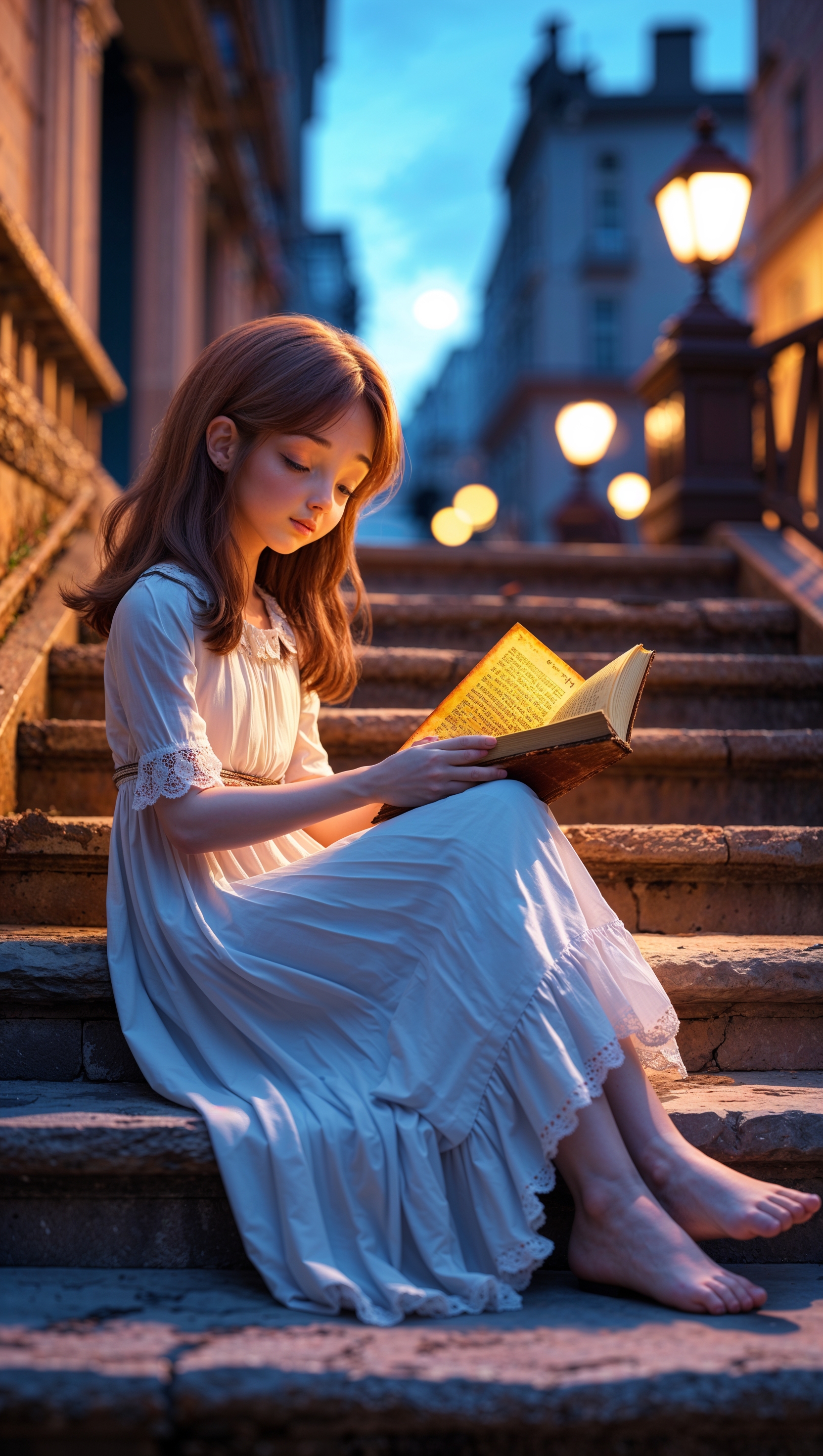 1664x2944 Girl sitting on stairs reading a book, warm city evening lighting