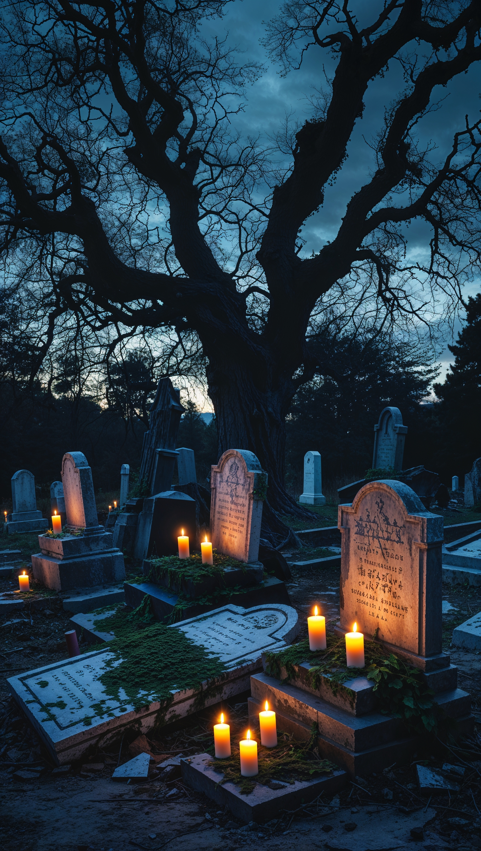 Abandoned graveyard at dusk with broken tombstones and flickering candles 1664x2944 Abandoned graveyard at dusk with broken tombstones and flickering candles