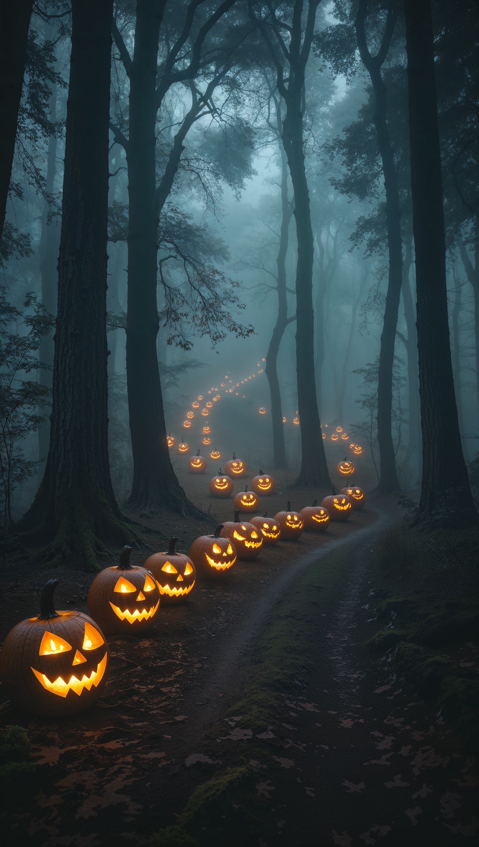 Cinematic foggy forest path lit by carved jack-o'-lanterns, spooky atmosphere 1664x2944 Cinematic foggy forest path lit by carved jack-o'-lanterns, spooky atmosphere