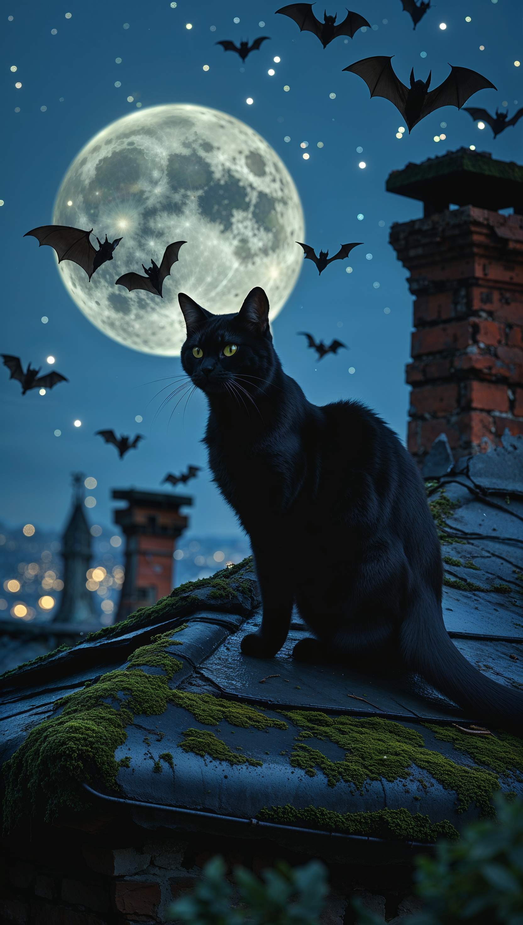 Silhouette of a black cat on a rooftop under full moon with flying bats 1664x2944 Silhouette of a black cat on a rooftop under full moon with flying bats
