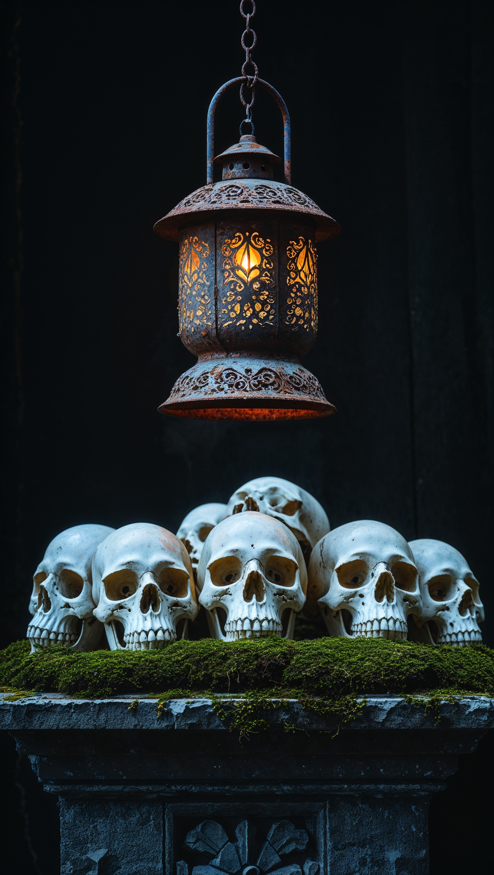 Old lantern swinging on a chain, lighting up carved skulls in the dark 1664x2944 Old lantern swinging on a chain, lighting up carved skulls in the dark