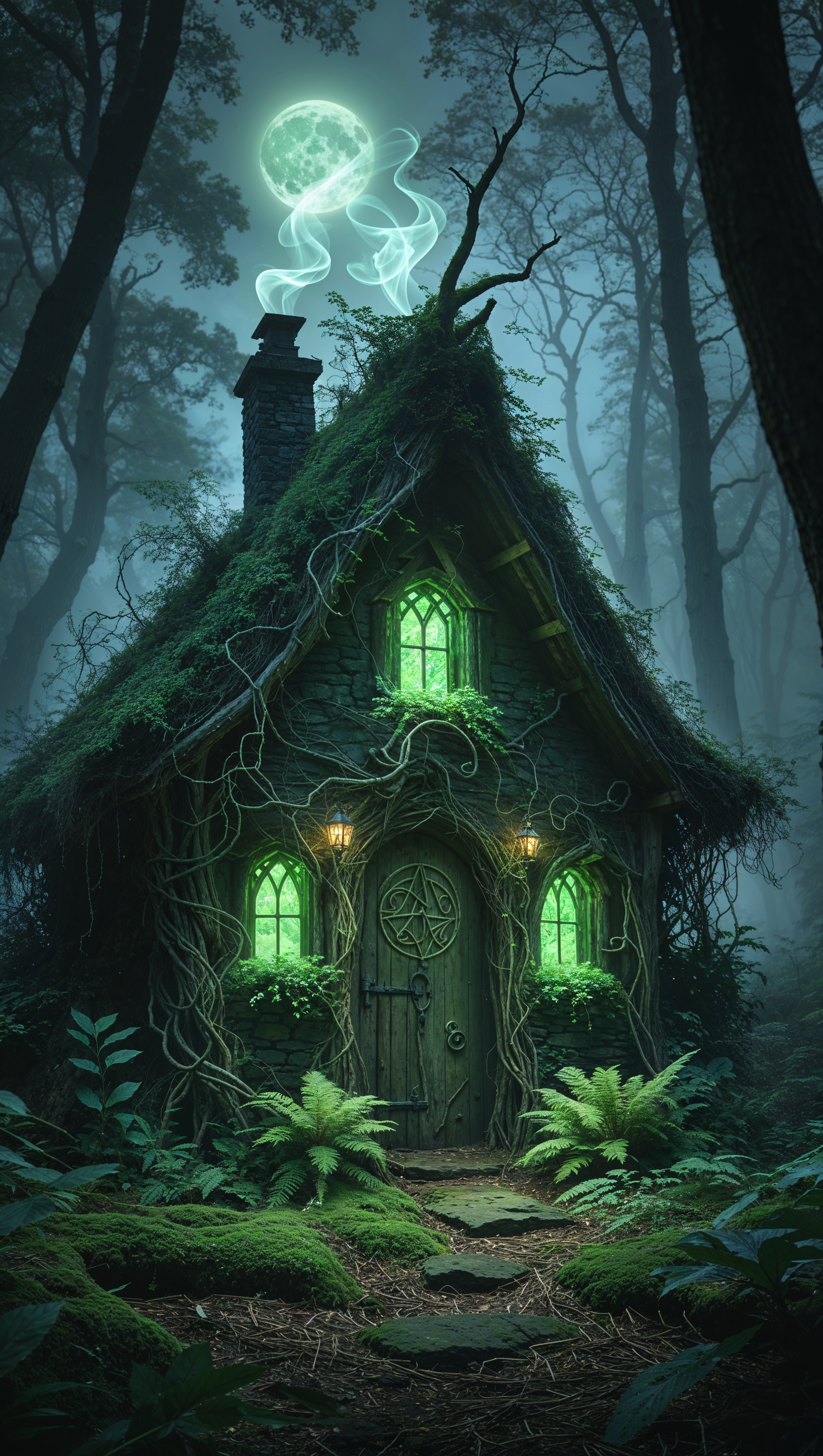 Witch’s cottage in the woods with glowing green lights and smoke rising 1664x2944 Witch’s cottage in the woods with glowing green lights and smoke rising