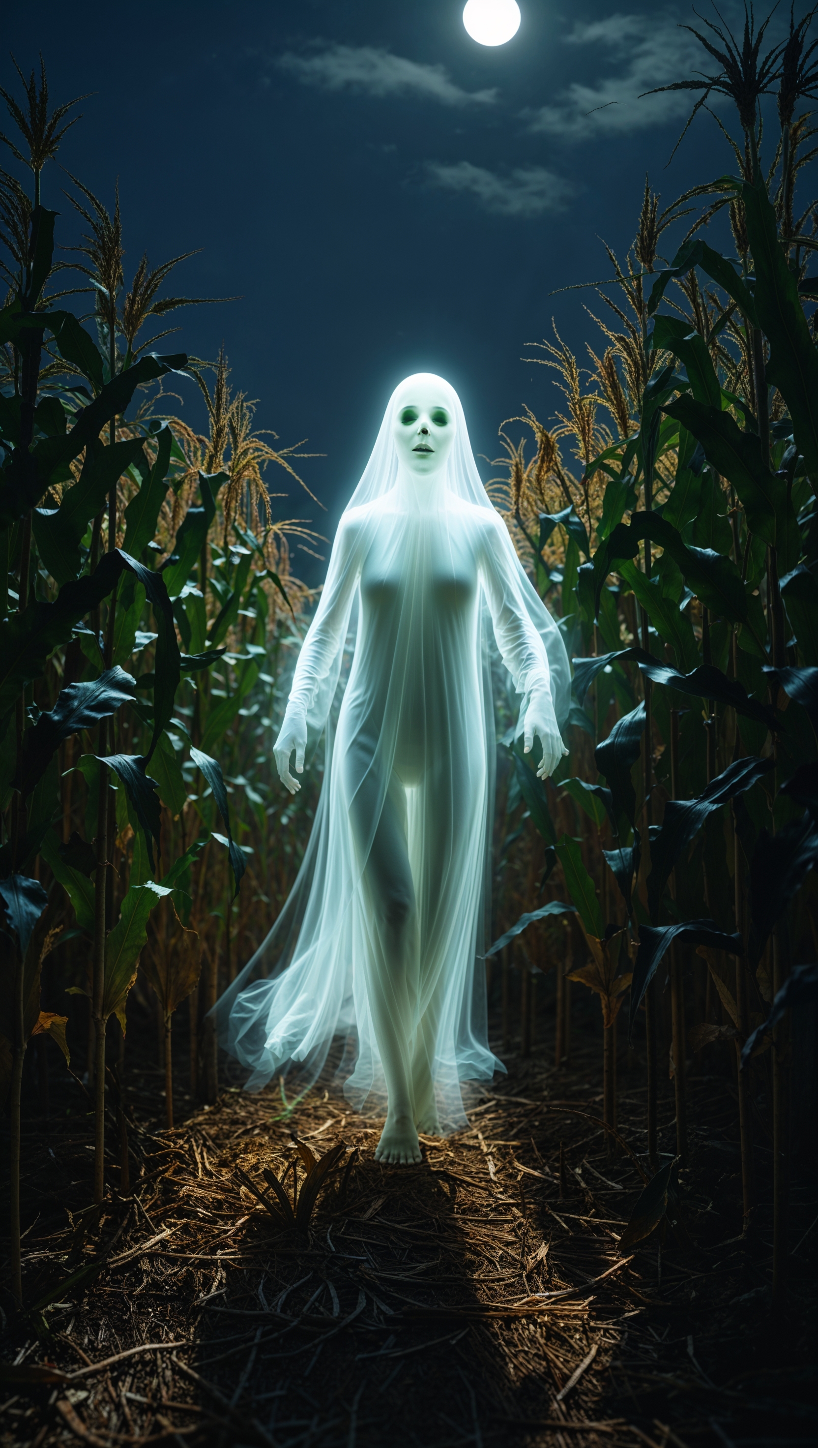 Glowing ghost figure walking through a cornfield at night, cinematic contrast 1664x2944 Glowing ghost figure walking through a cornfield at night, cinematic contrast