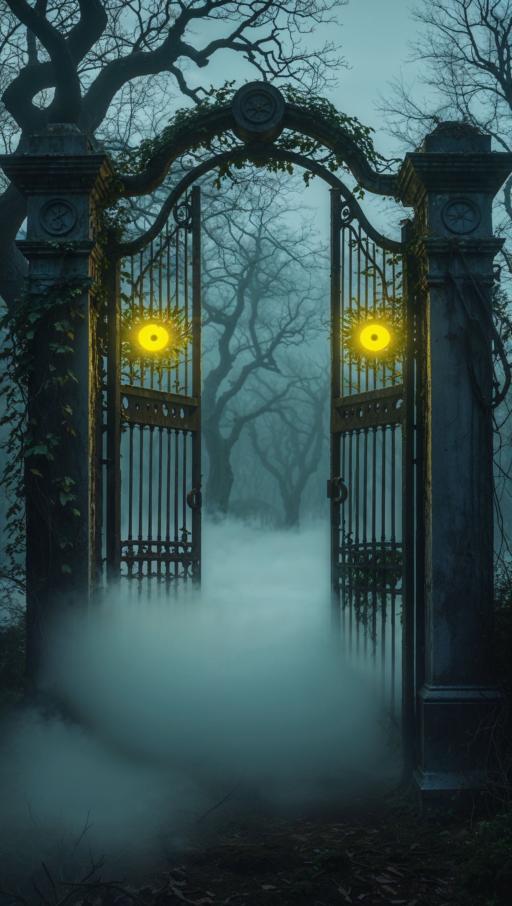 Cemetery gate half open with fog pouring out and glowing eyes in the mist 1664x2944 Cemetery gate half open with fog pouring out and glowing eyes in the mist