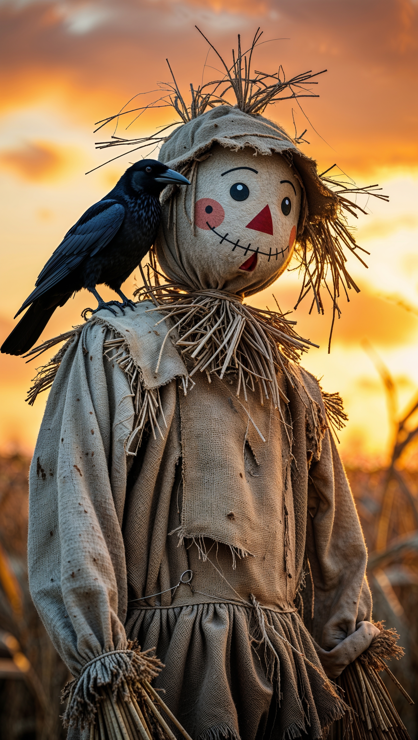 Scarecrow with torn clothes and crow on shoulder, backlit by orange sky 1664x2944 Scarecrow with torn clothes and crow on shoulder, backlit by orange sky