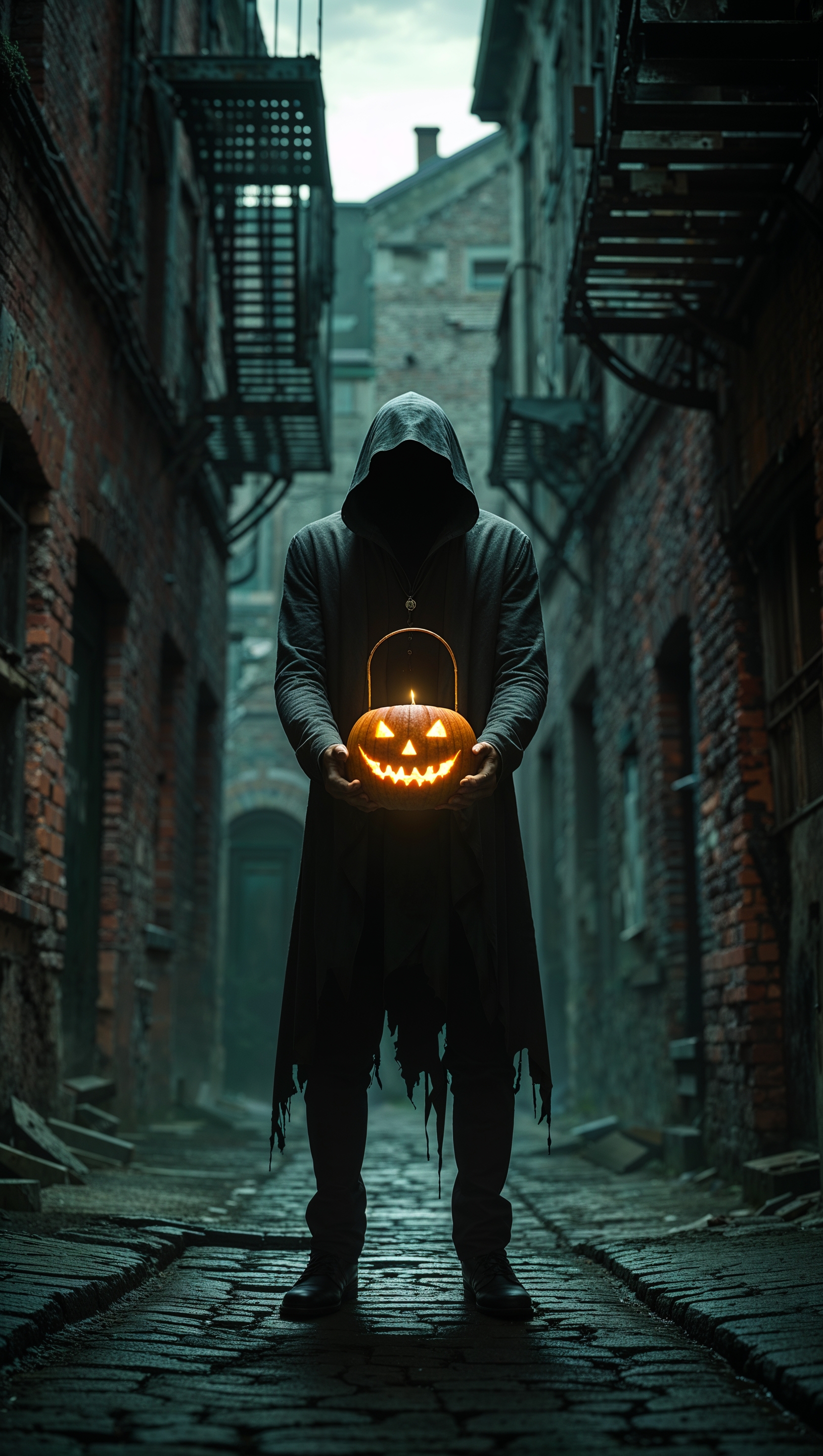 Shadow of a figure holding a pumpkin lantern in an empty alley 1664x2944 Shadow of a figure holding a pumpkin lantern in an empty alley