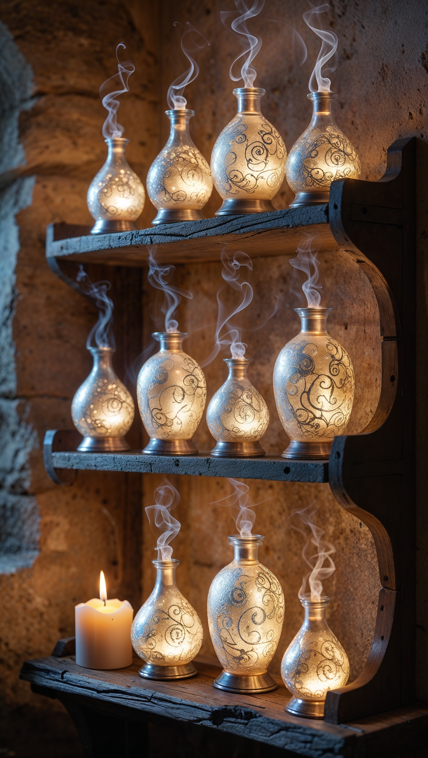 Magic potion bottles glowing on wooden shelf with smoke trails 1664x2944 Magic potion bottles glowing on wooden shelf with smoke trails