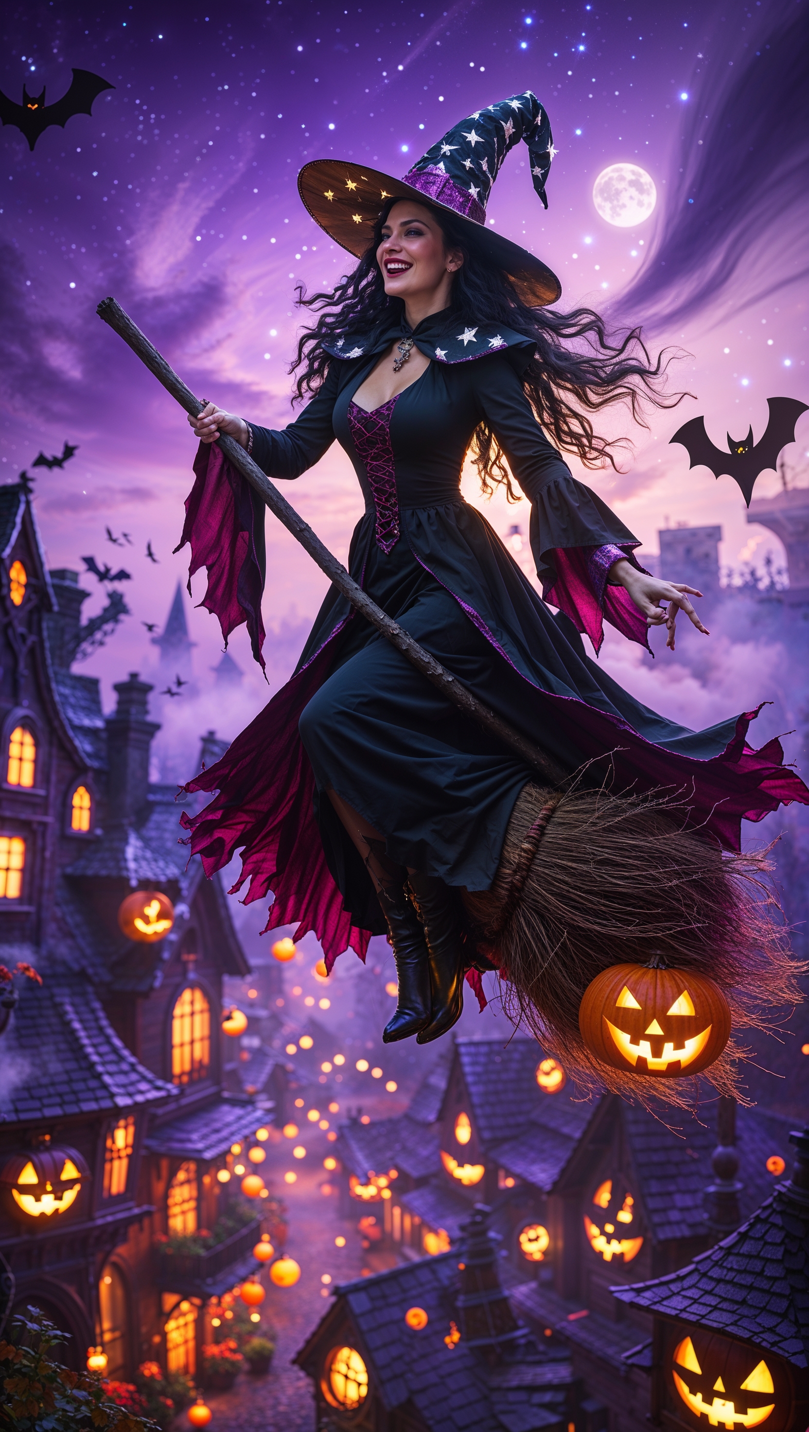 Witch flying on broomstick over glowing Halloween town, purple sky 1664x2944 Witch flying on broomstick over glowing Halloween town, purple sky