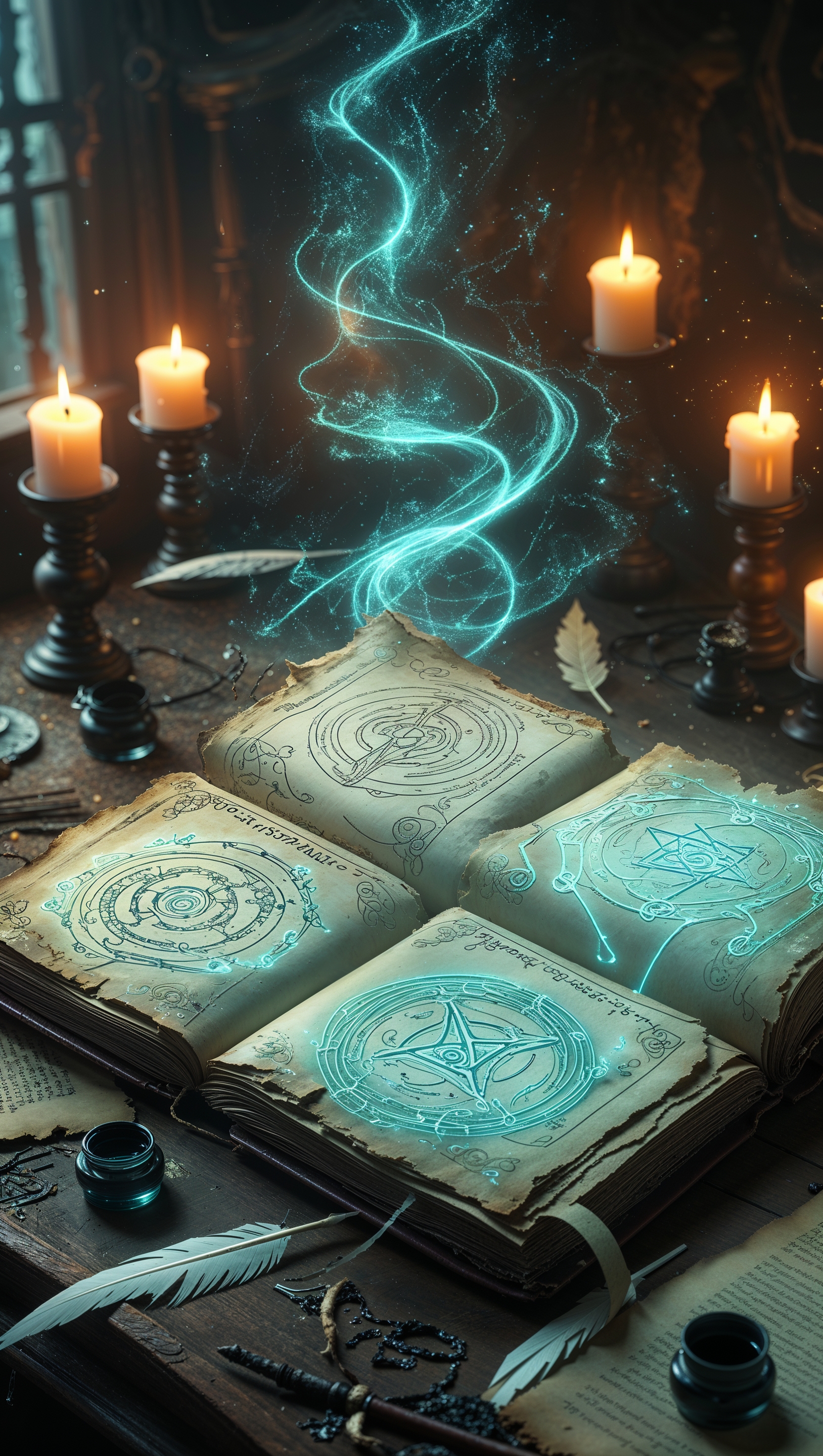Spellbook open on candle-lit desk with flying pages and glowing symbols 1664x2944 Spellbook open on candle-lit desk with flying pages and glowing symbols