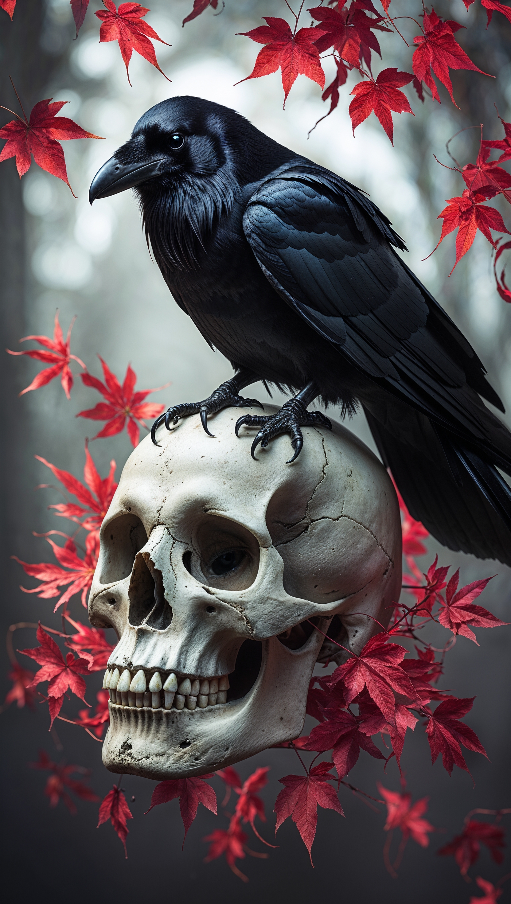 Black raven perched on skull surrounded by floating red leaves 1664x2944 Black raven perched on skull surrounded by floating red leaves