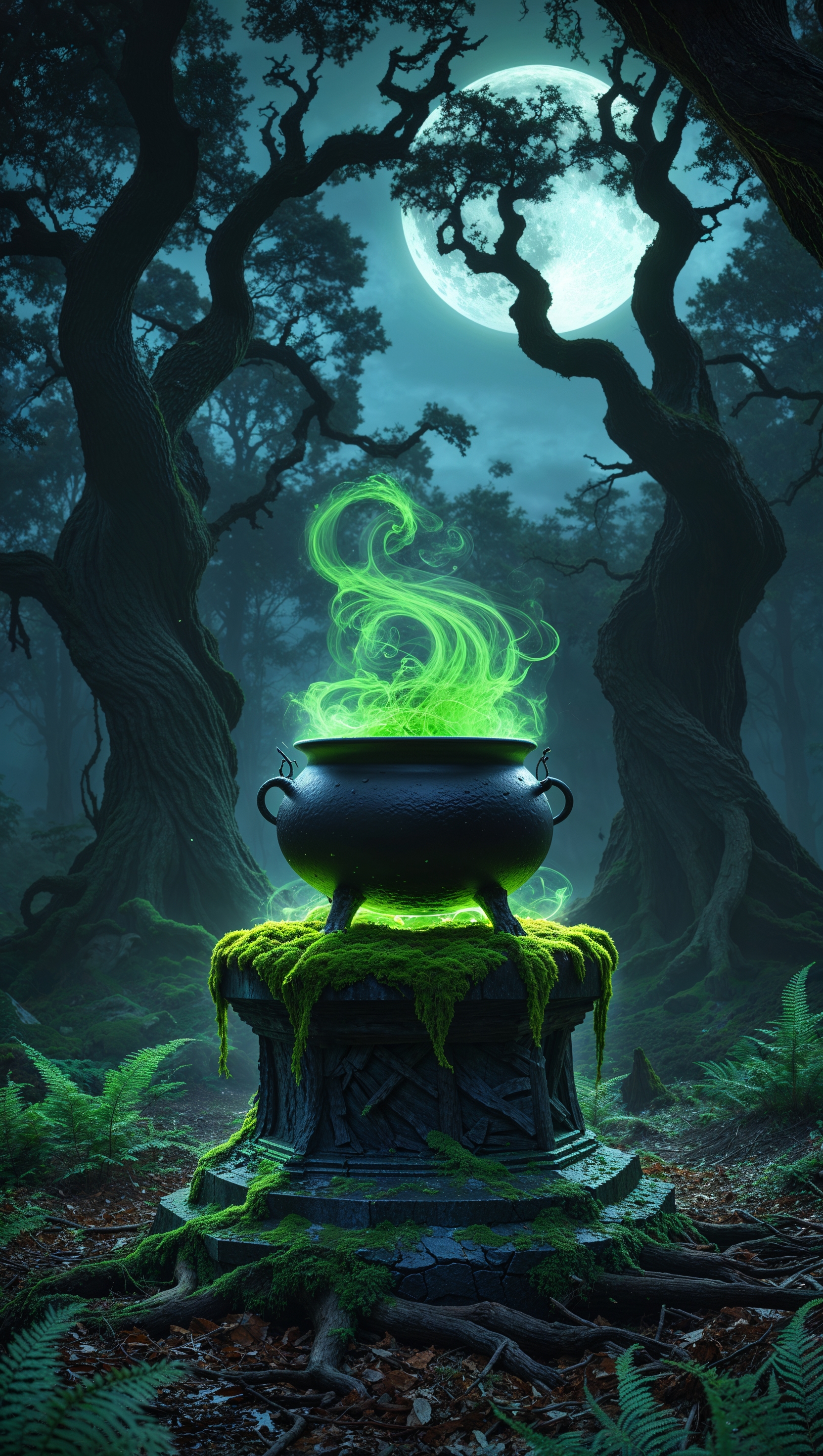Cauldron bubbling with neon green liquid in dark forest clearing 1664x2944 Cauldron bubbling with neon green liquid in dark forest clearing
