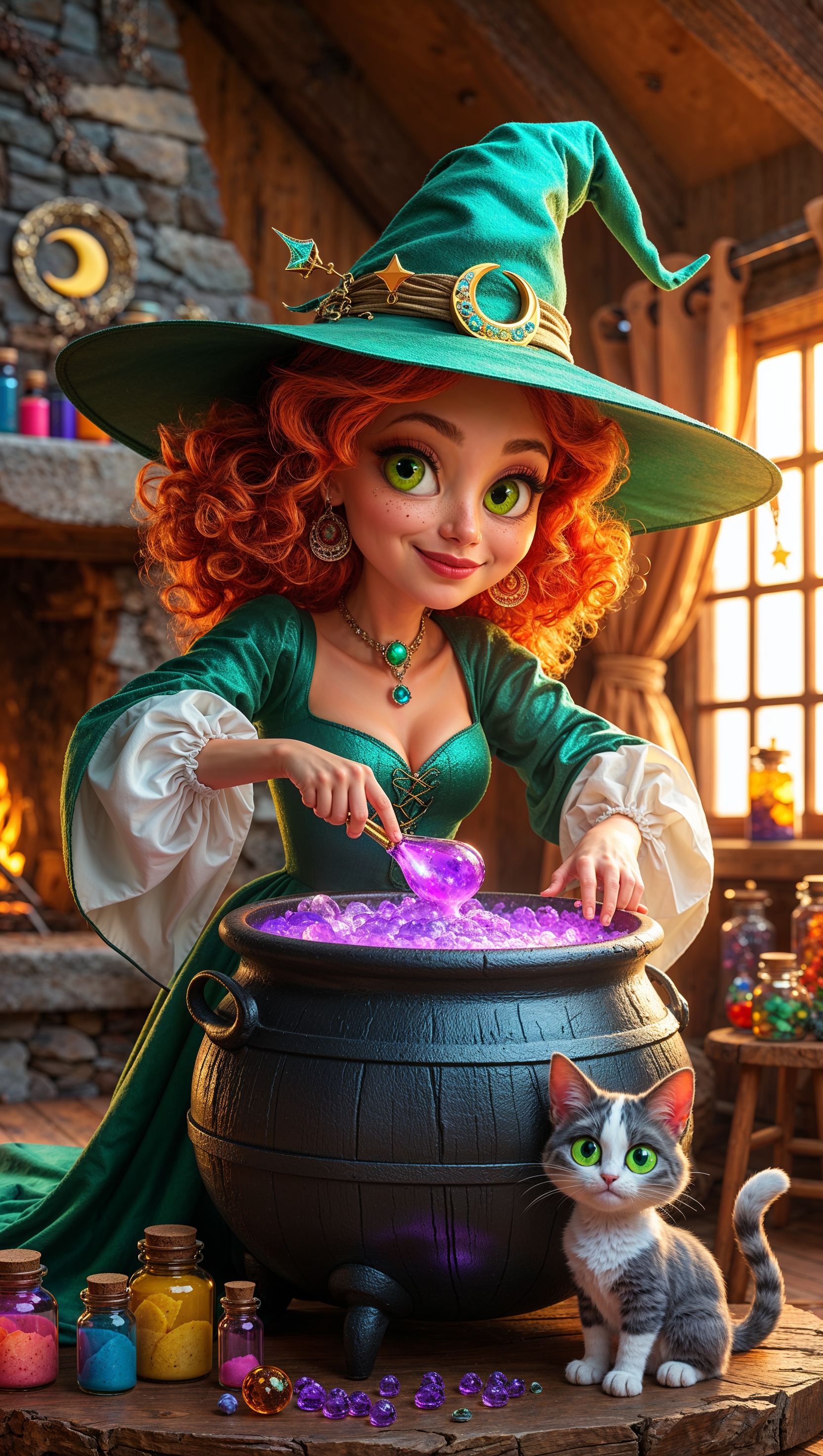 Cute cartoon witch mixing potions with cat helper in cozy cabin 1664x2944 Cute cartoon witch mixing potions with cat helper in cozy cabin