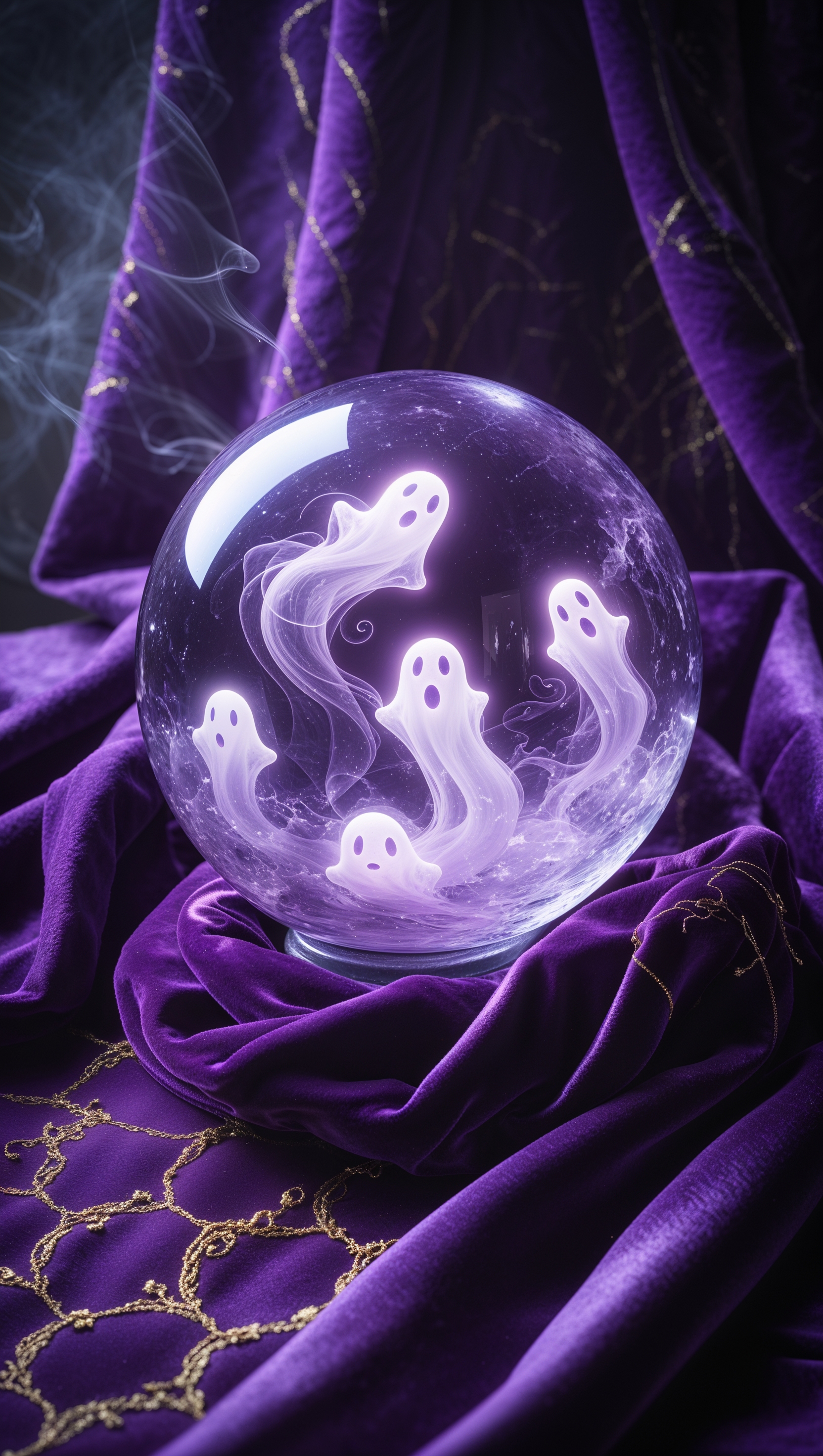 Crystal ball glowing with swirling ghosts inside, on velvet cloth 1664x2944 Crystal ball glowing with swirling ghosts inside, on velvet cloth