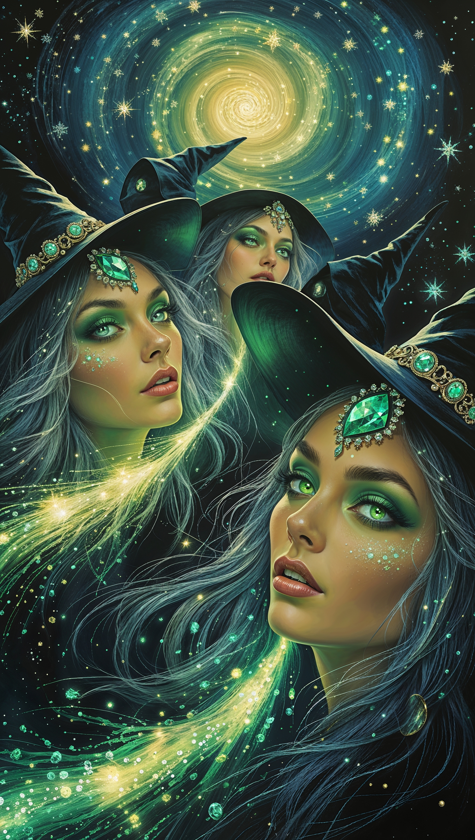 Vertical scene of witches flying past stars, leaving glowing trails 1664x2944 Vertical scene of witches flying past stars, leaving glowing trails