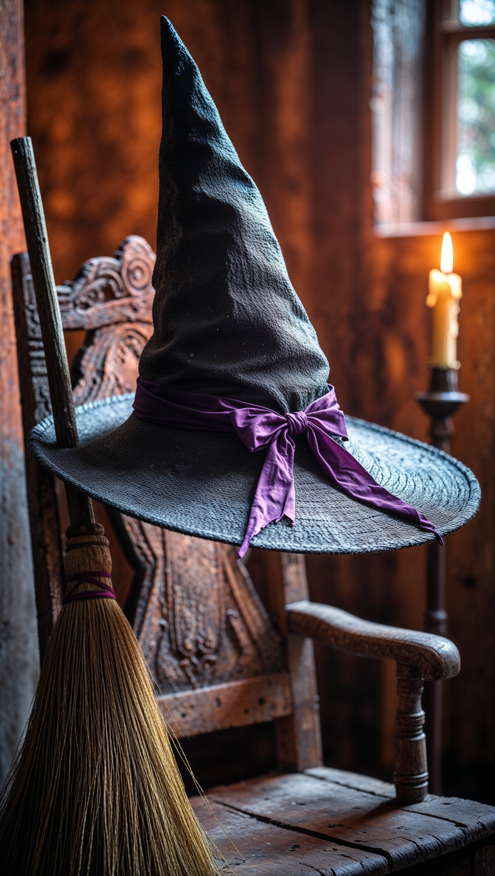 Witch’s hat and broom leaning on old wooden chair in candlelight 1664x2944 Witch’s hat and broom leaning on old wooden chair in candlelight