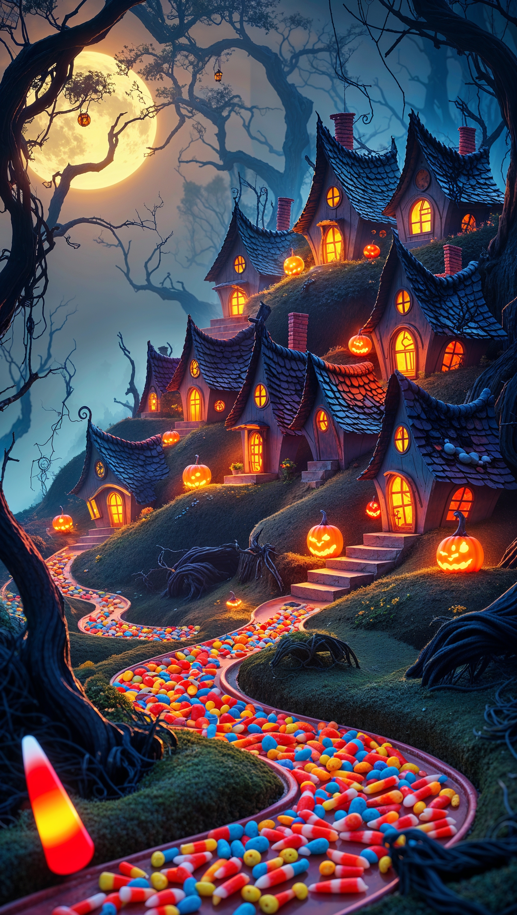 Vertical cartoon-style Halloween village with tiny houses and candy paths 1664x2944 Vertical cartoon-style Halloween village with tiny houses and candy paths