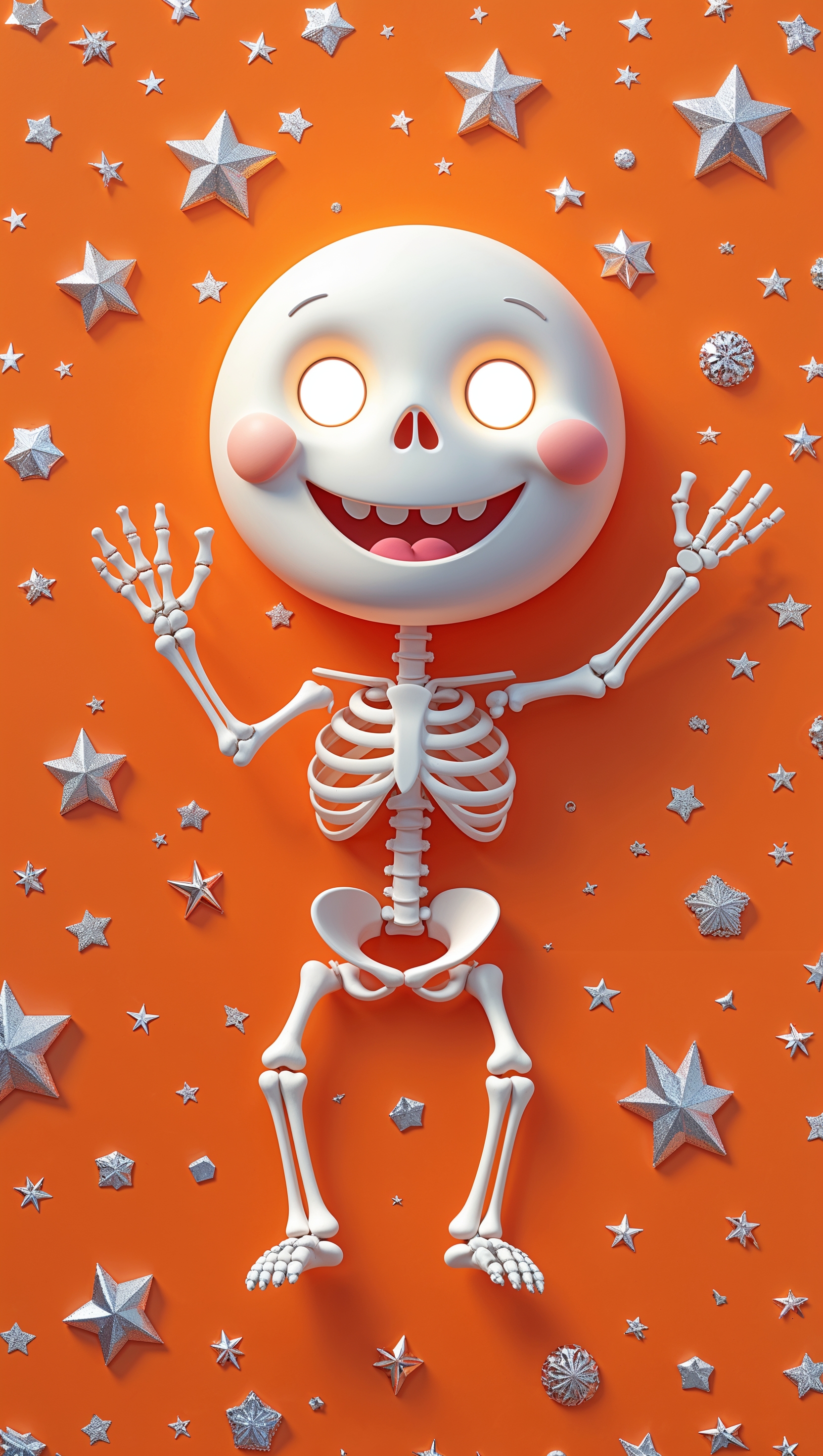 Cute skeleton character waving on orange background with stars 1664x2944 Cute skeleton character waving on orange background with stars