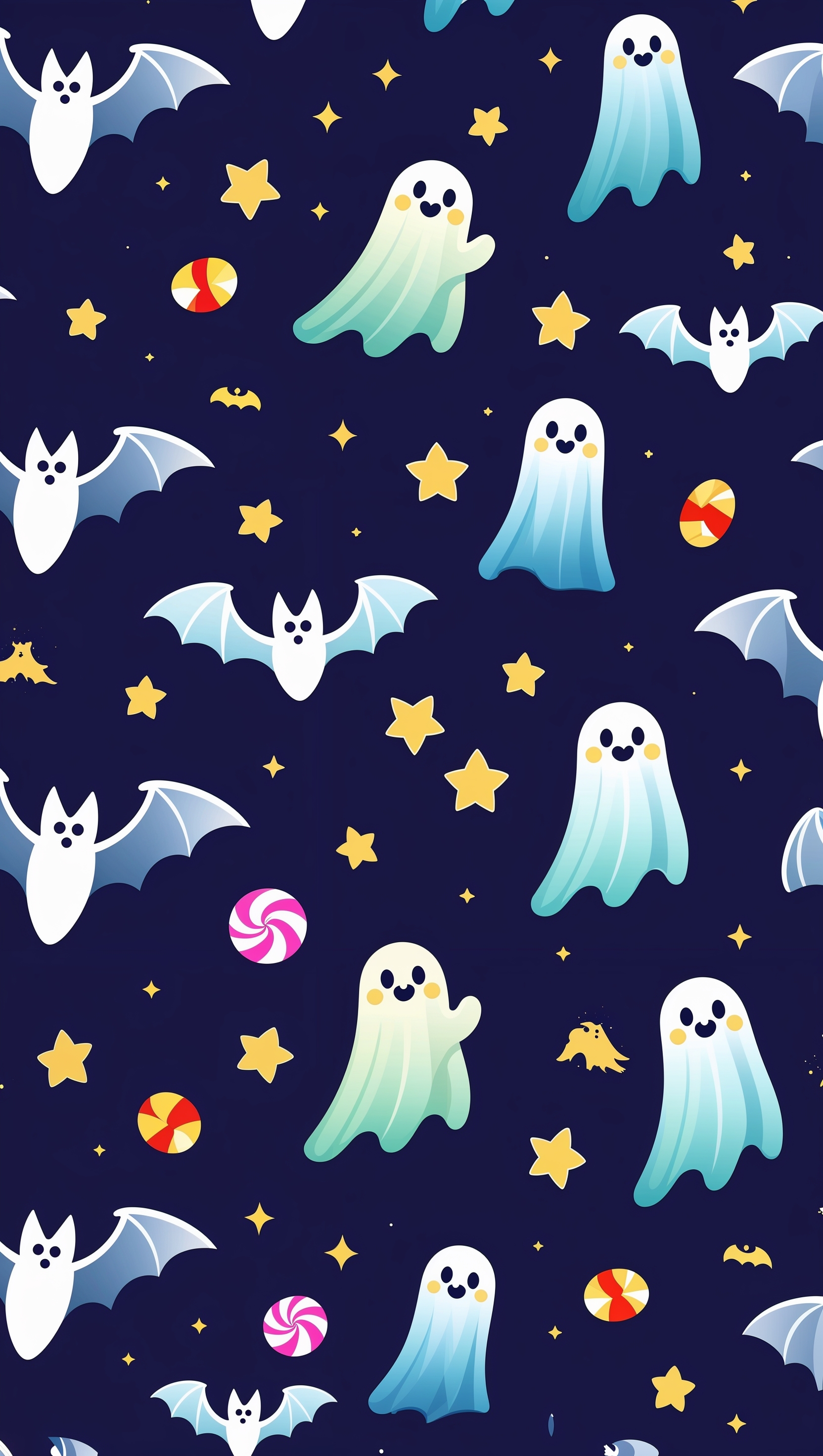 Flat vector Halloween wallpaper with bats, stars, ghosts, and candy icons 1664x2944 Flat vector Halloween wallpaper with bats, stars, ghosts, and candy icons