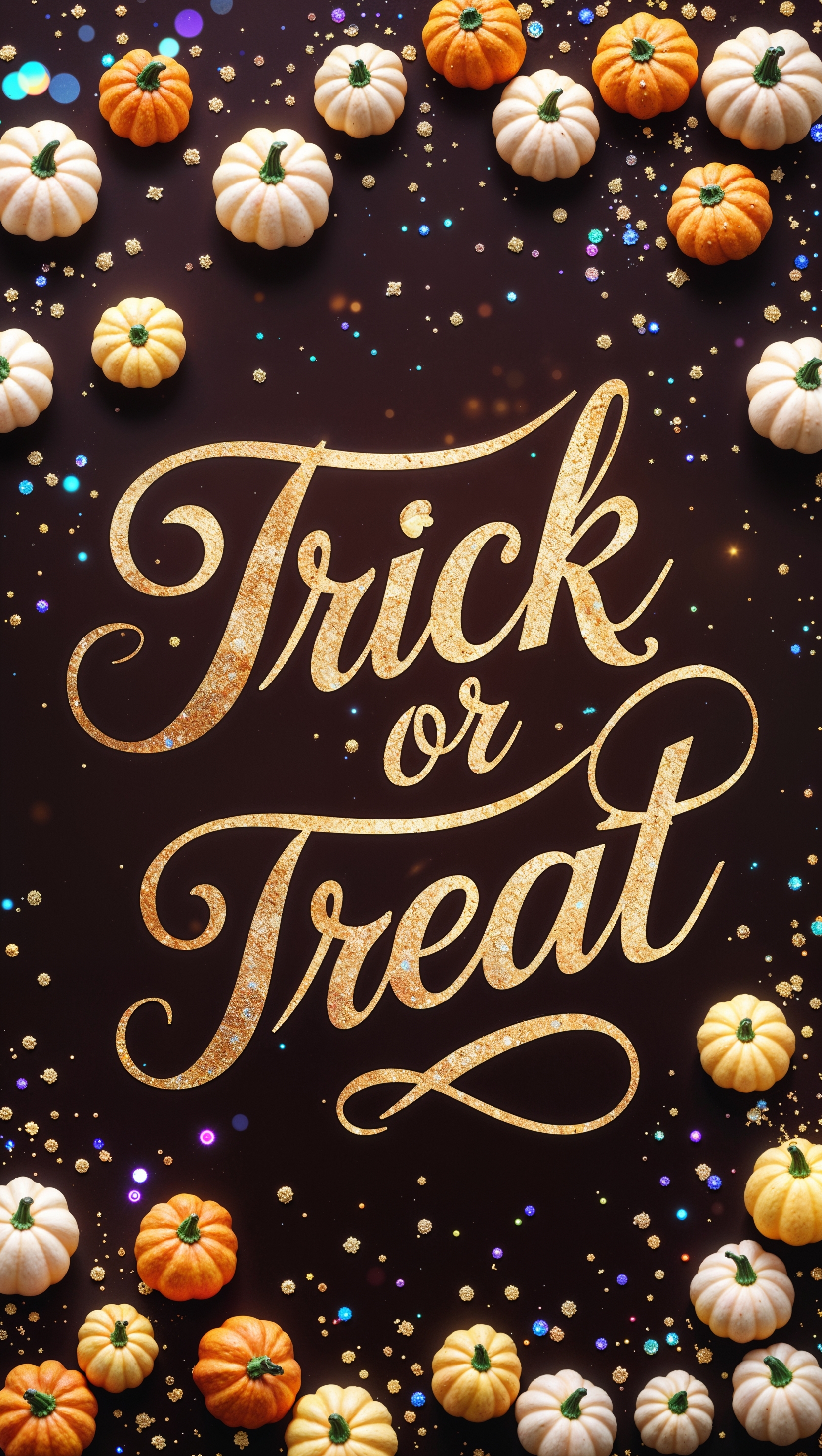 "Trick or Treat" in stylish script with tiny pumpkins and sparkles 1664x2944 "Trick or Treat" in stylish script with tiny pumpkins and sparkles