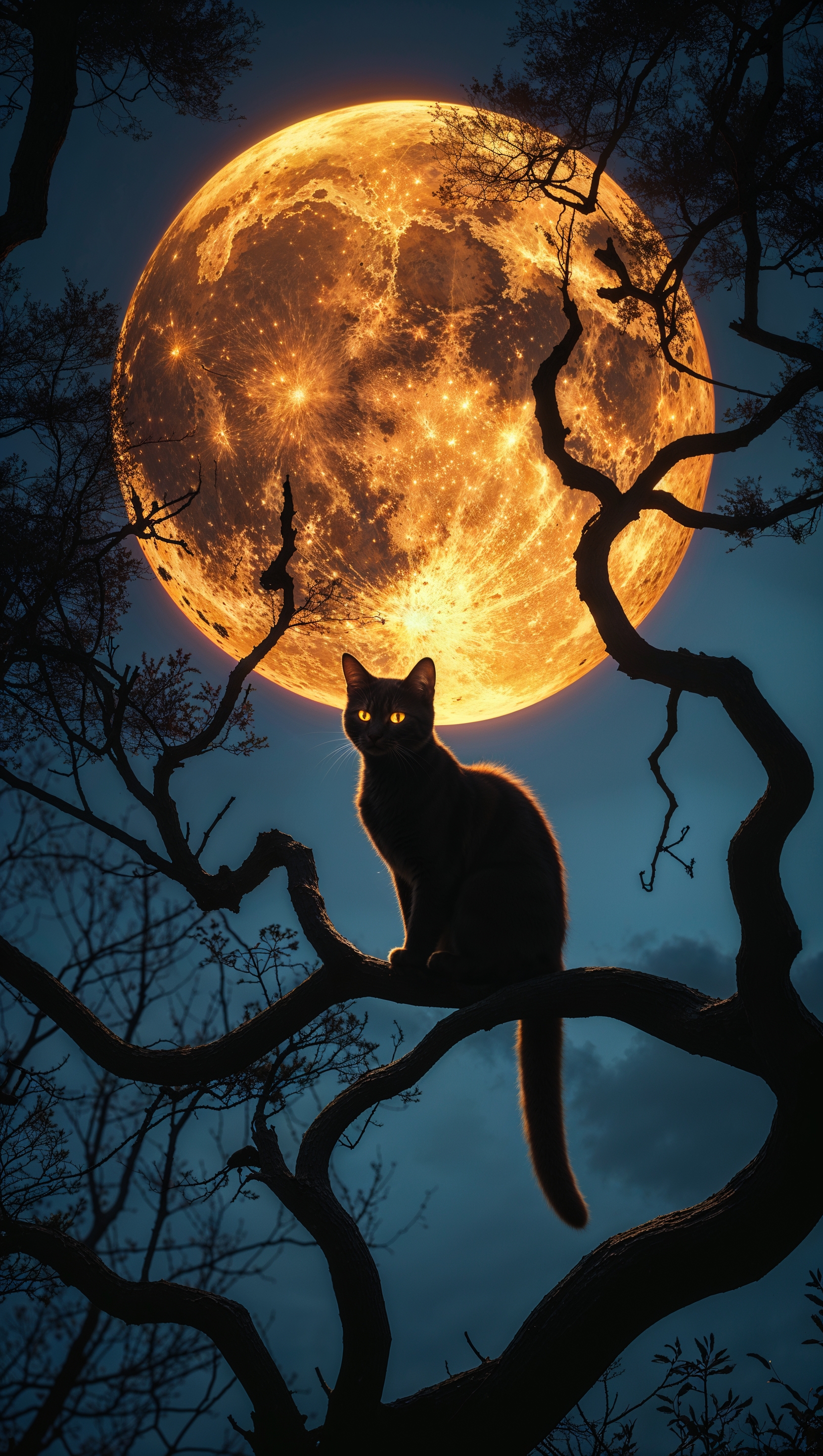 Glowing orange moon with shadowy branches and cat silhouette 1664x2944 Glowing orange moon with shadowy branches and cat silhouette