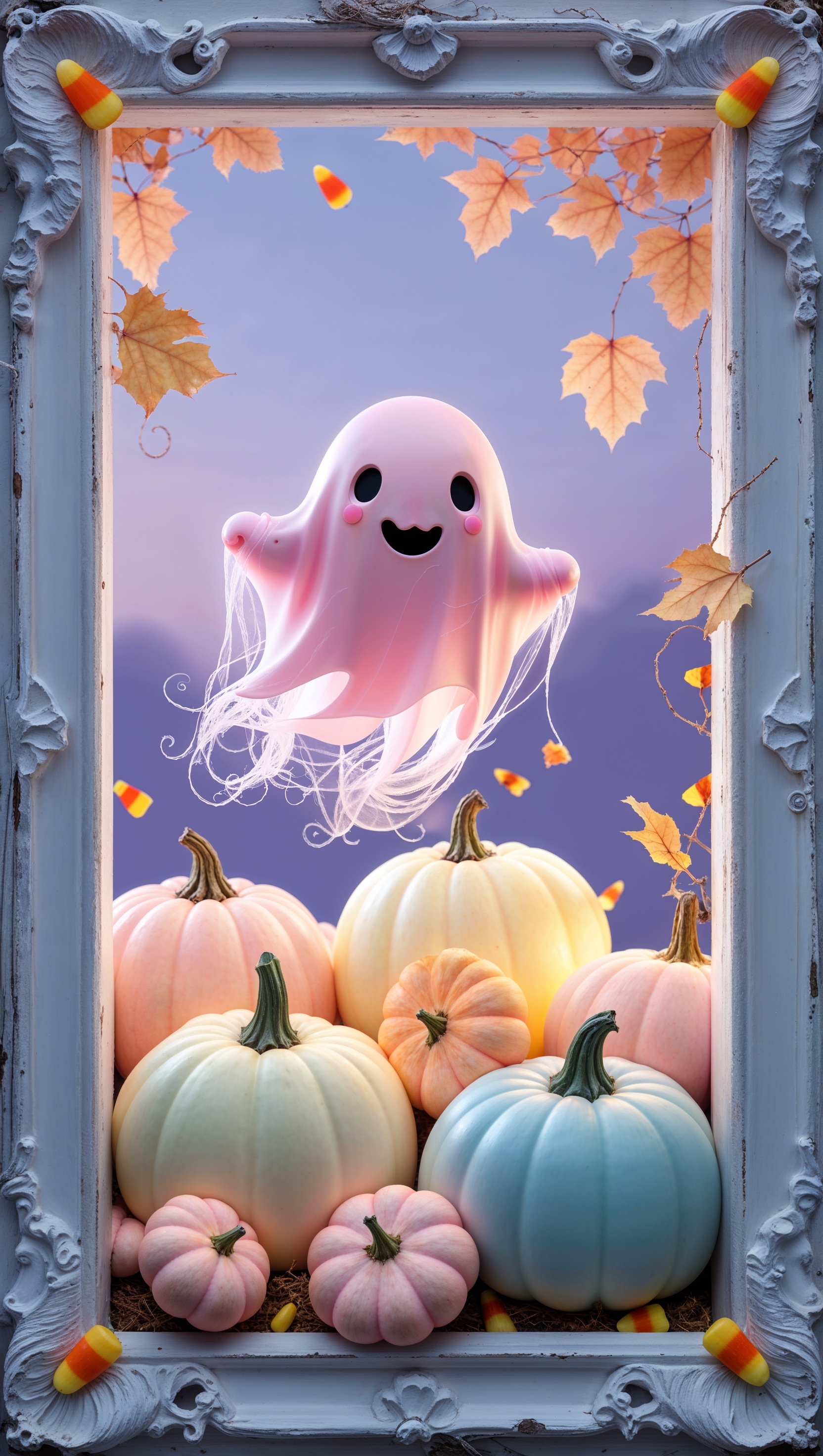 Pastel Halloween scene with pink ghost and soft pumpkins, cute aesthetic 1664x2944 Pastel Halloween scene with pink ghost and soft pumpkins, cute aesthetic