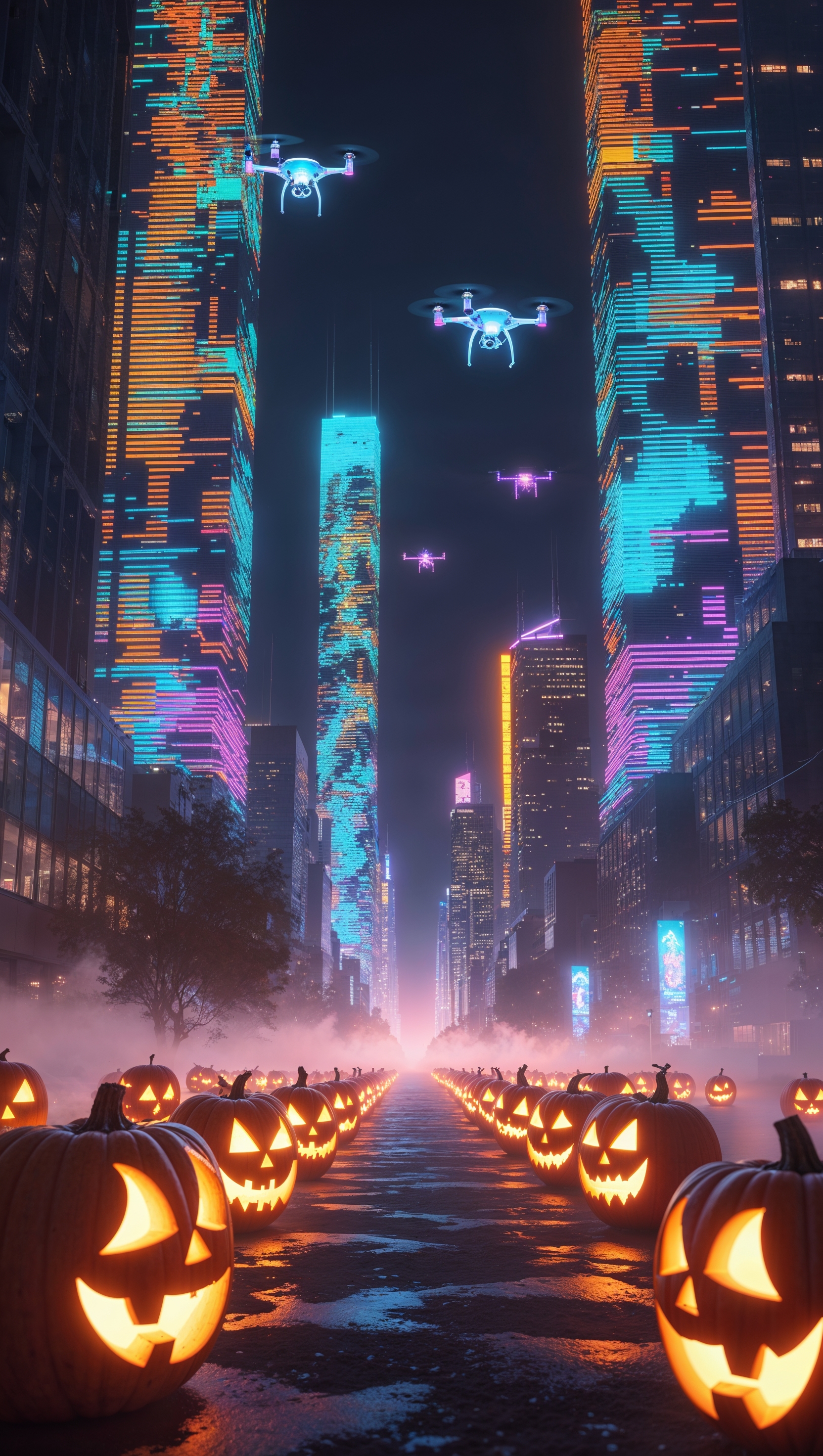 Cyberpunk Halloween night with neon pumpkins and glitchy buildings 1664x2944 Cyberpunk Halloween night with neon pumpkins and glitchy buildings