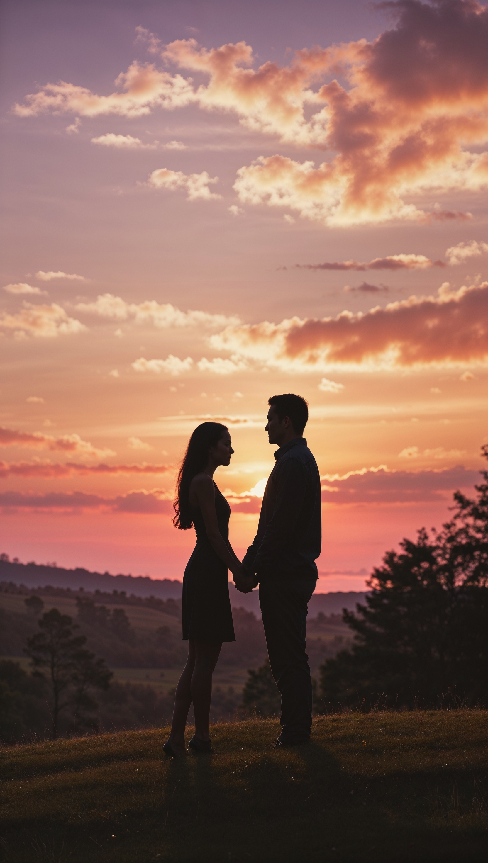 1664x2944 Romantic sunset sky with two silhouettes holding hands on a hill
