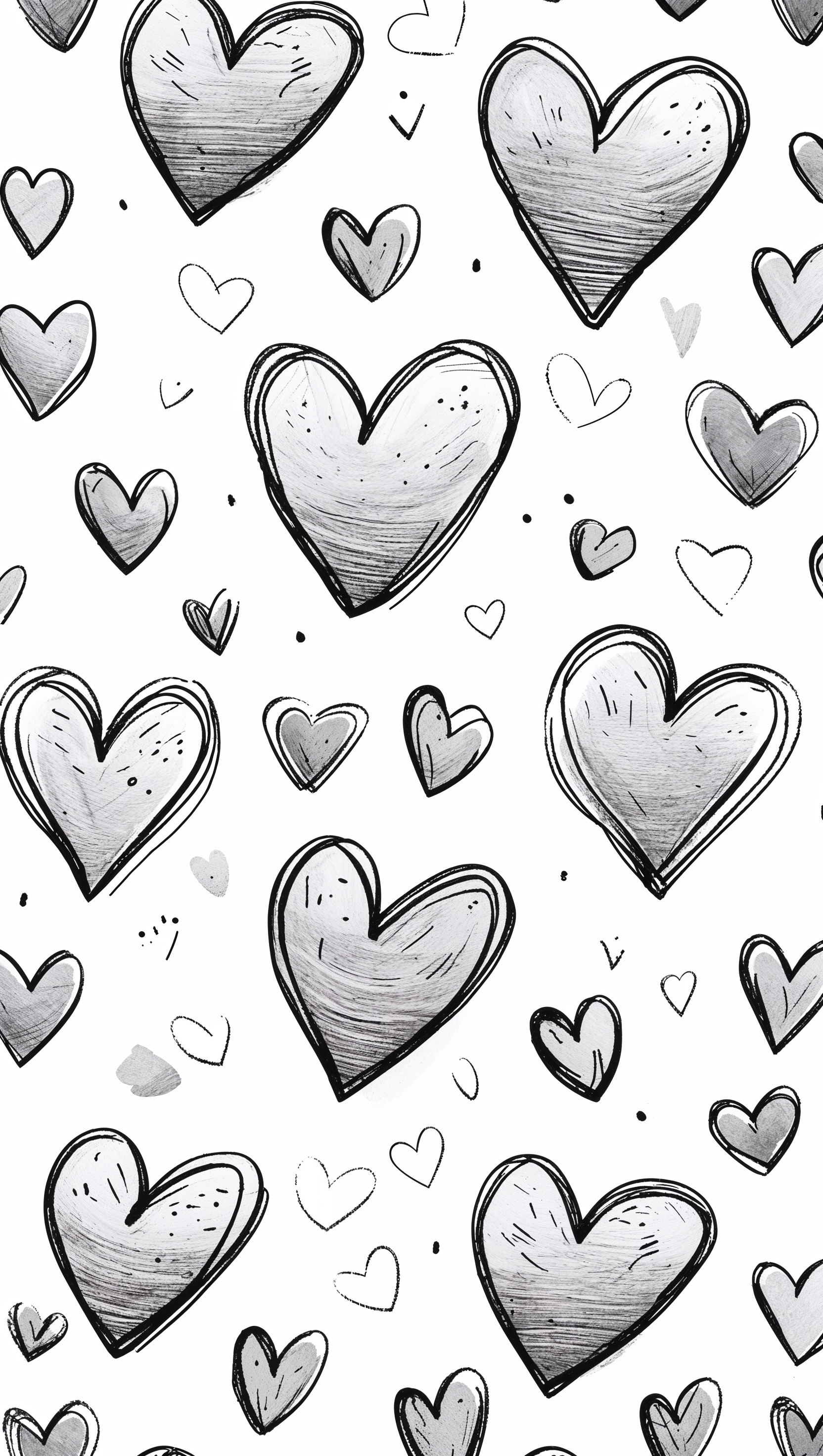 1664x2944 Hand-drawn doodle hearts in black and white, cute and simple