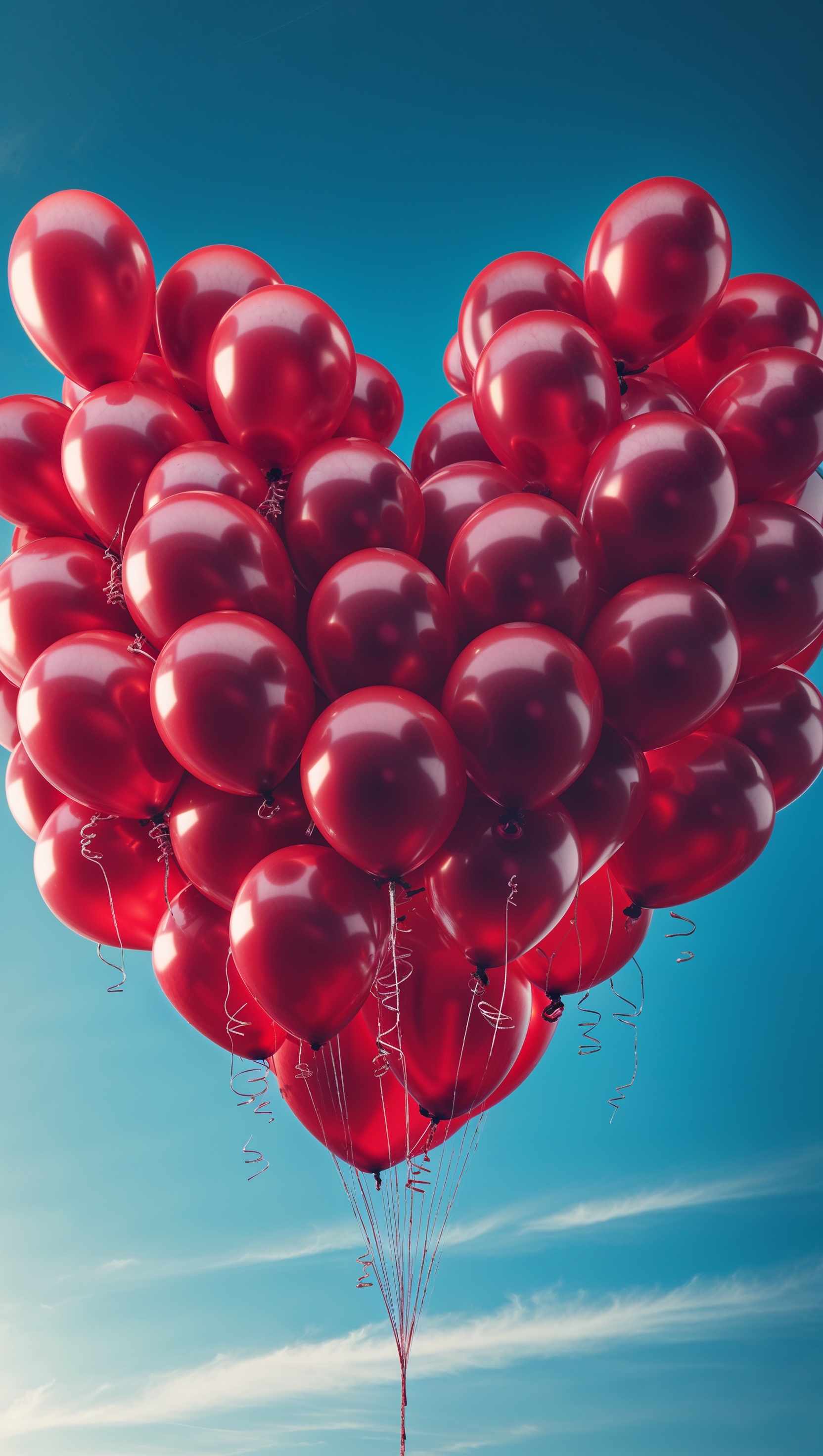1664x2944 Floating red balloons in heart shape against clear blue sky