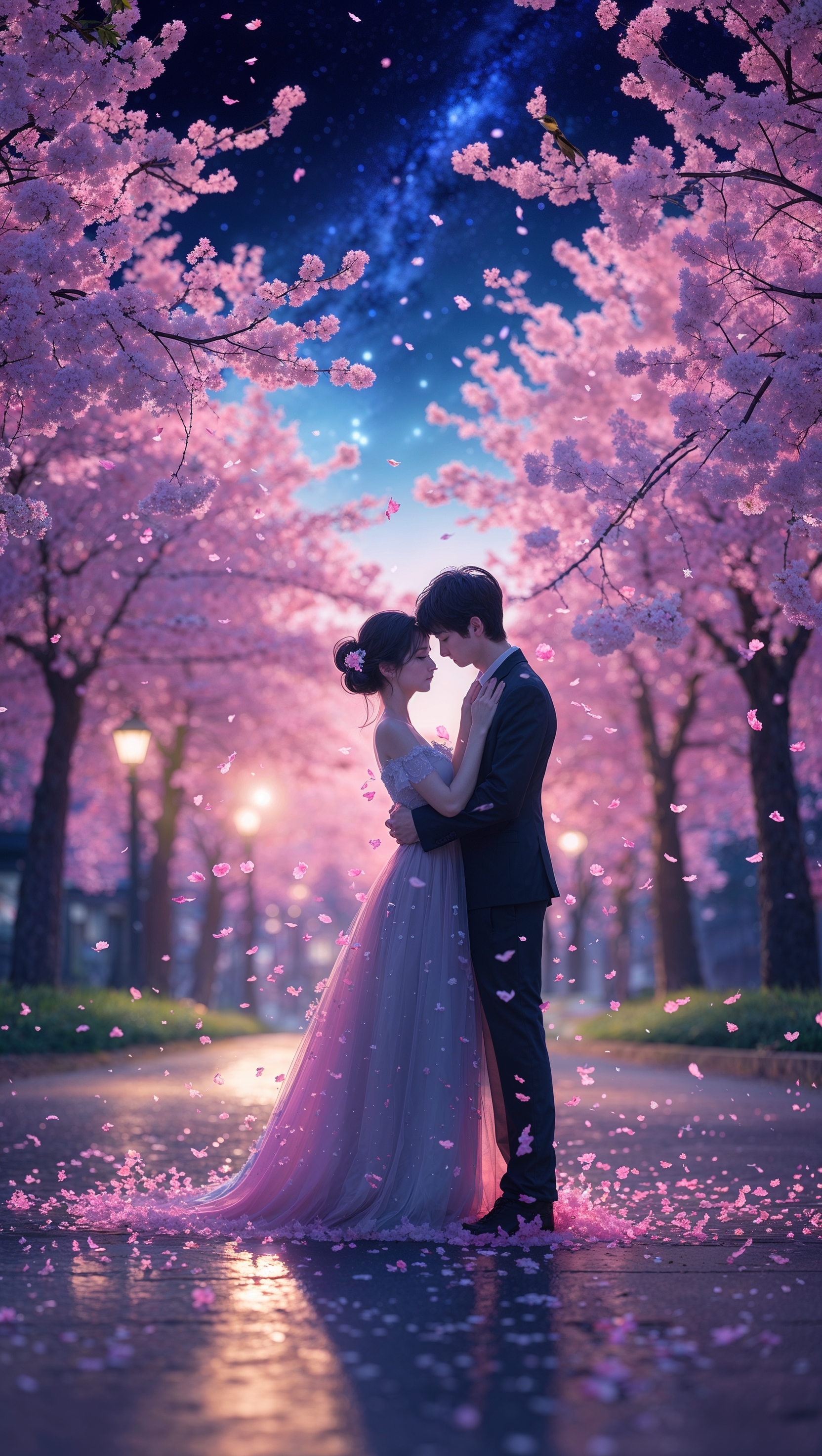1664x2944 Couple silhouettes under cherry blossom rain at night