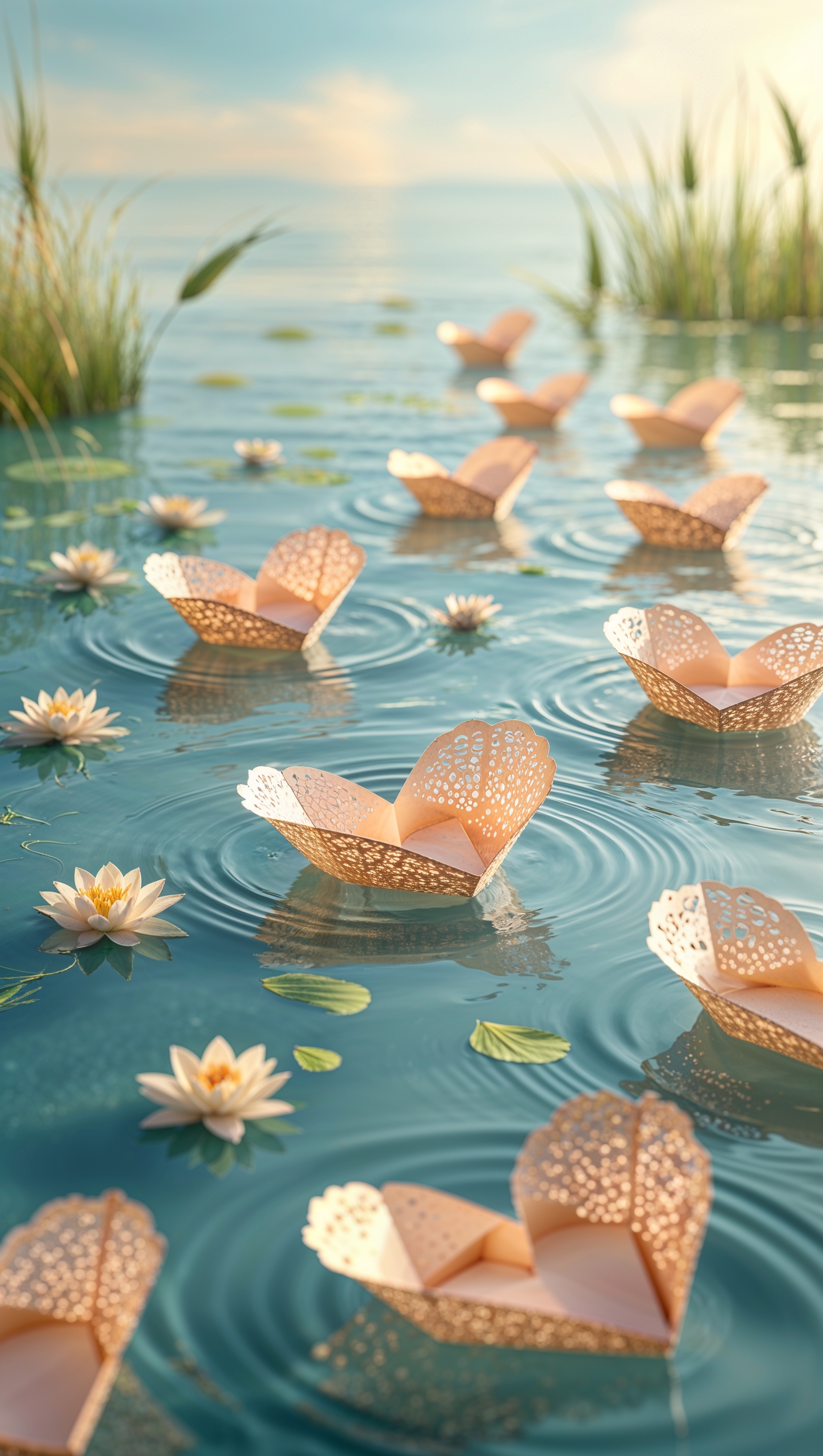 1664x2944 Floating paper boats shaped like hearts on a calm lake