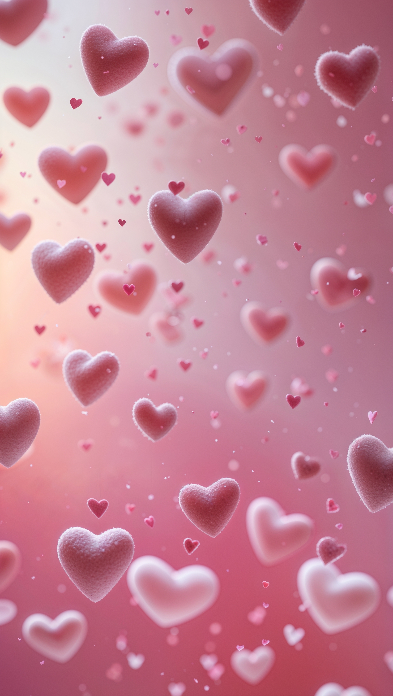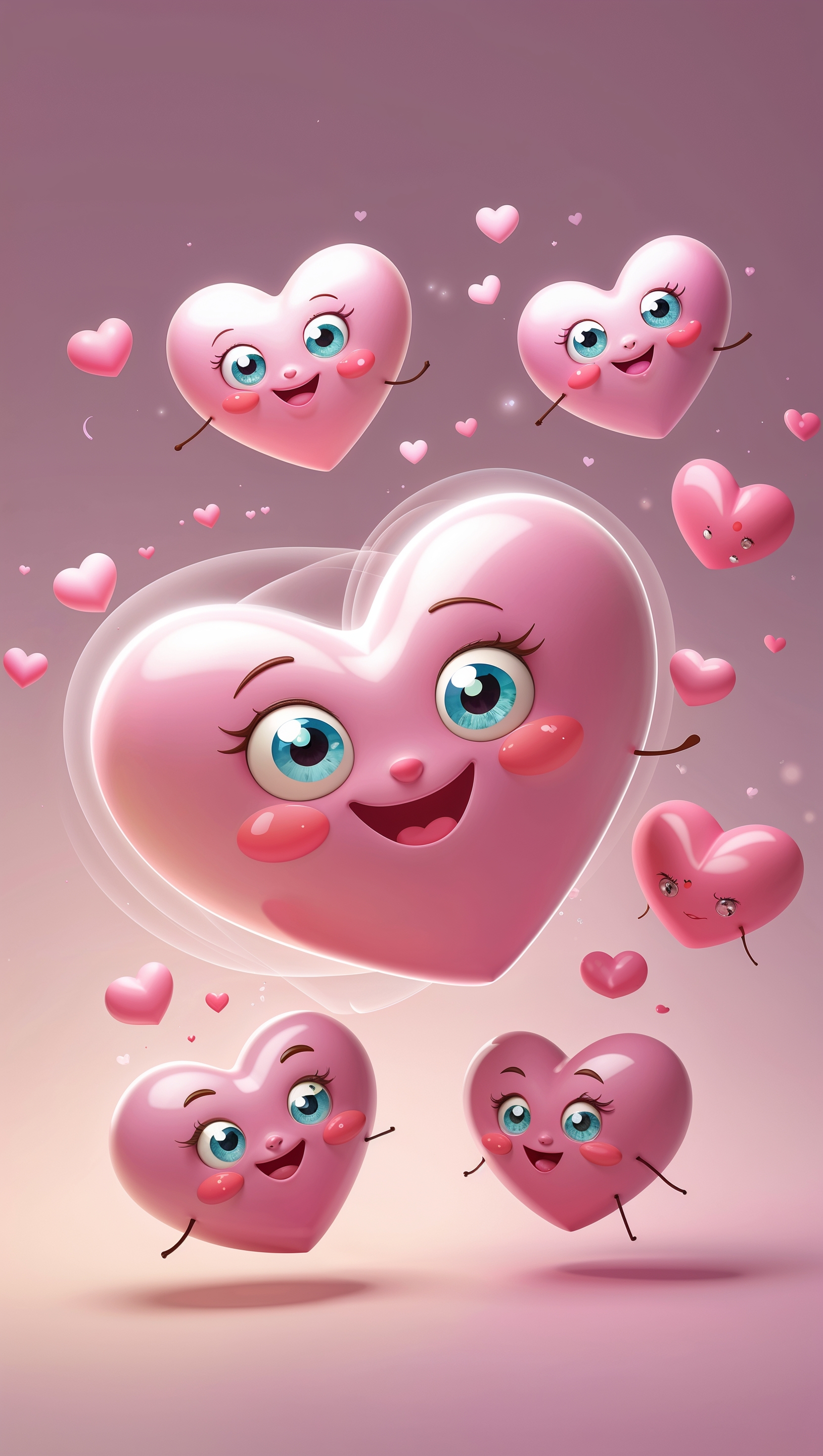 1664x2944 Cute cartoon hearts with faces floating around a pink background