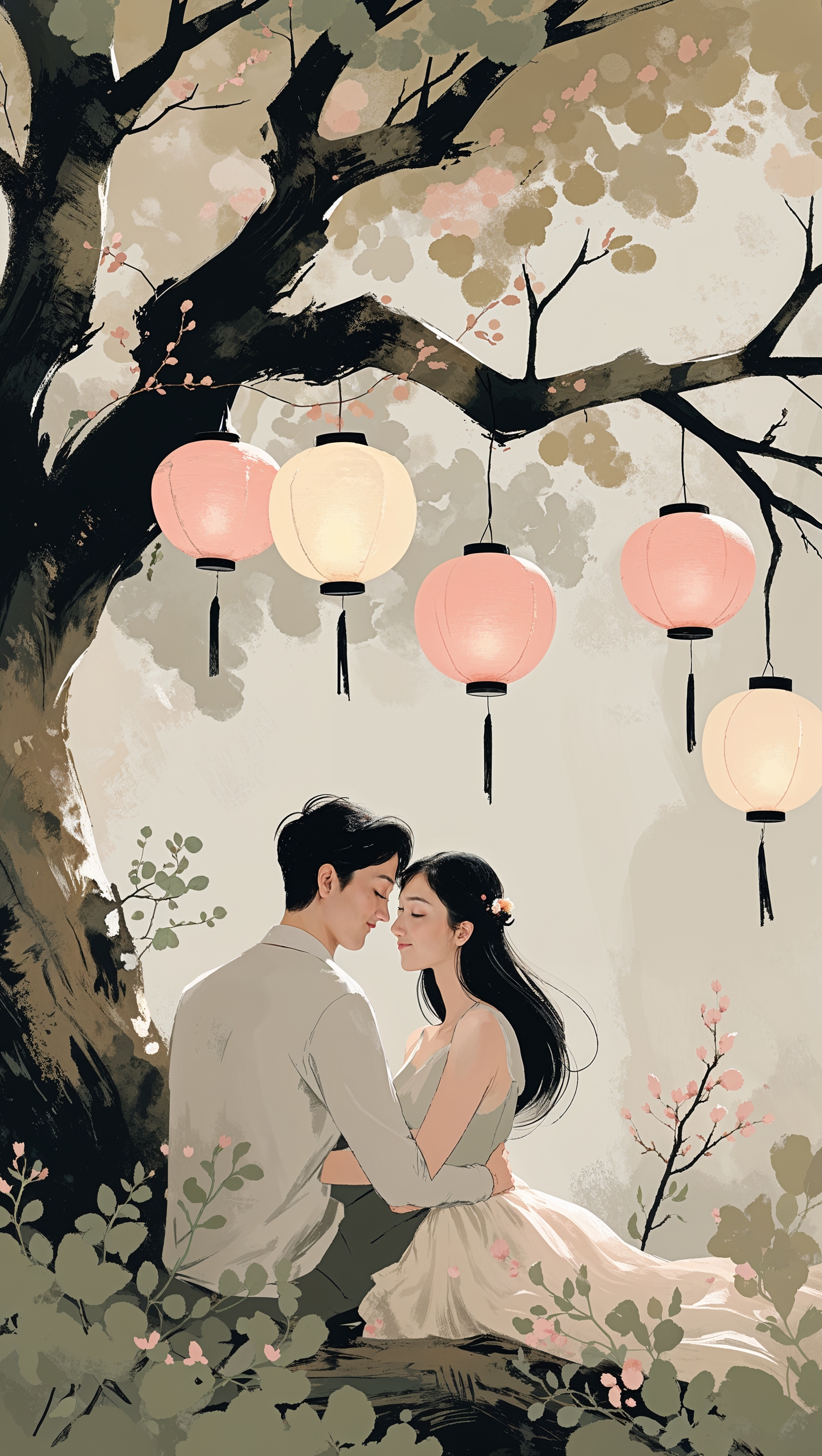 1664x2944 Couple sitting under a tree with lanterns, romantic minimalist art