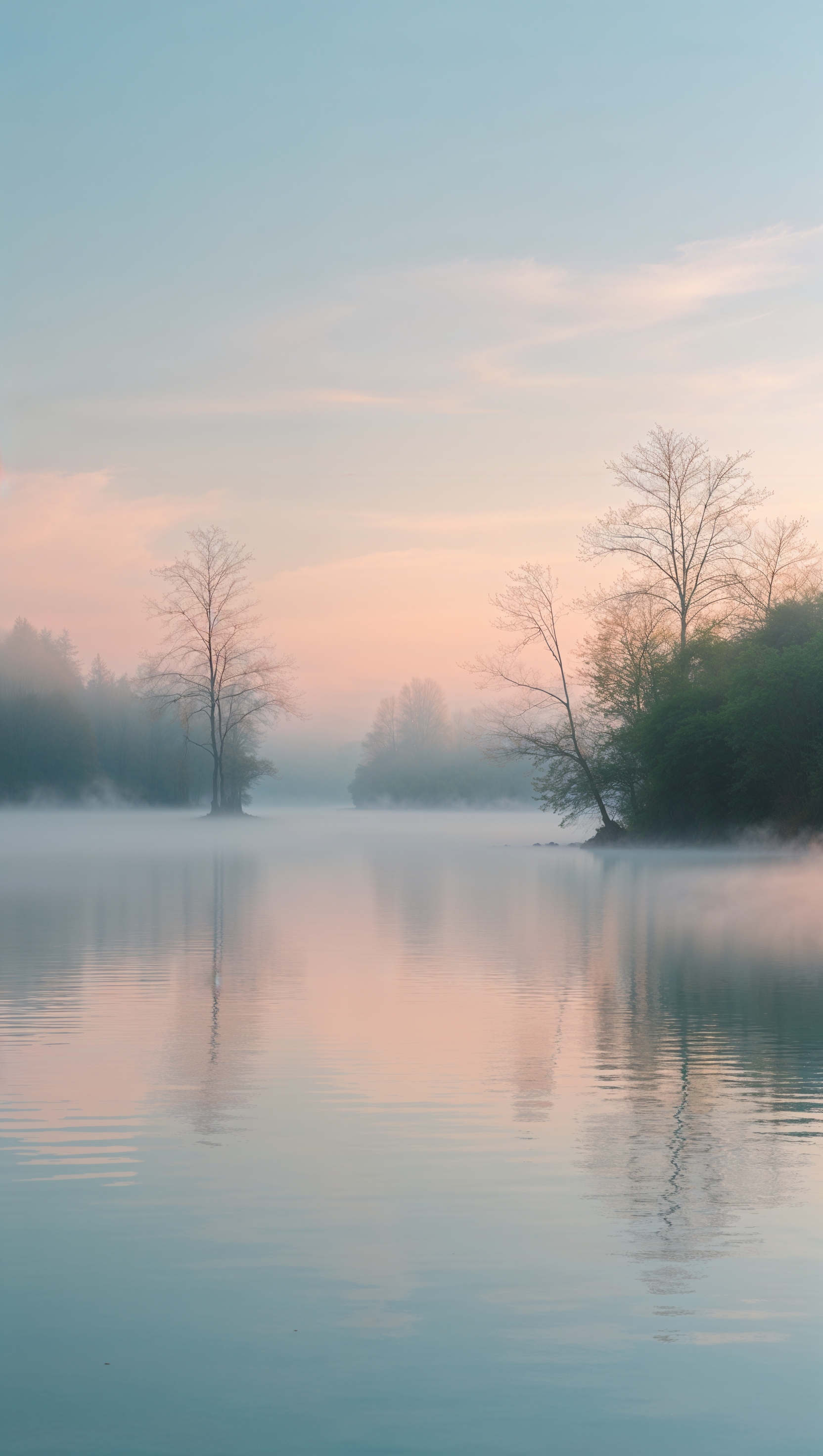 Serene lake at dawn with mist and soft reflections 1664x2944 Serene lake at dawn with mist and soft reflections