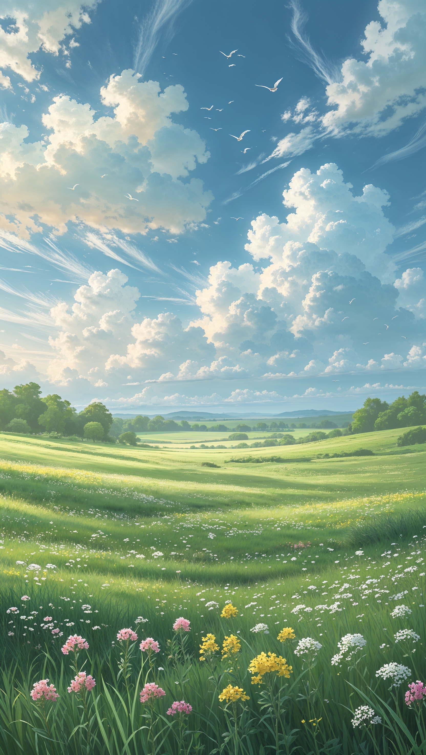 Soft green meadow under light cloudy sky, peaceful atmosphere 1664x2944 Soft green meadow under light cloudy sky, peaceful atmosphere