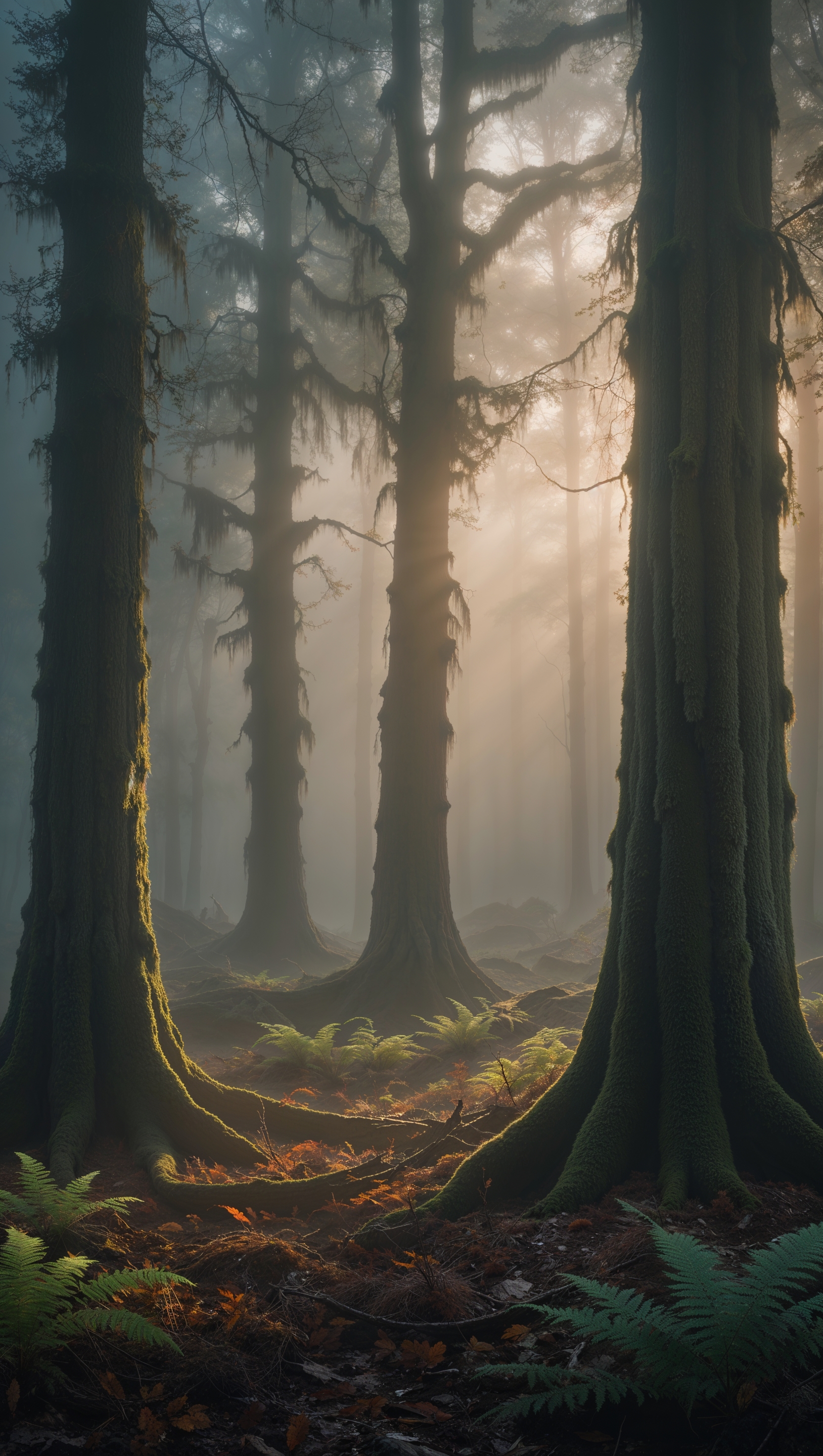 Foggy forest landscape with soft light filtering through trees 1664x2944 Foggy forest landscape with soft light filtering through trees