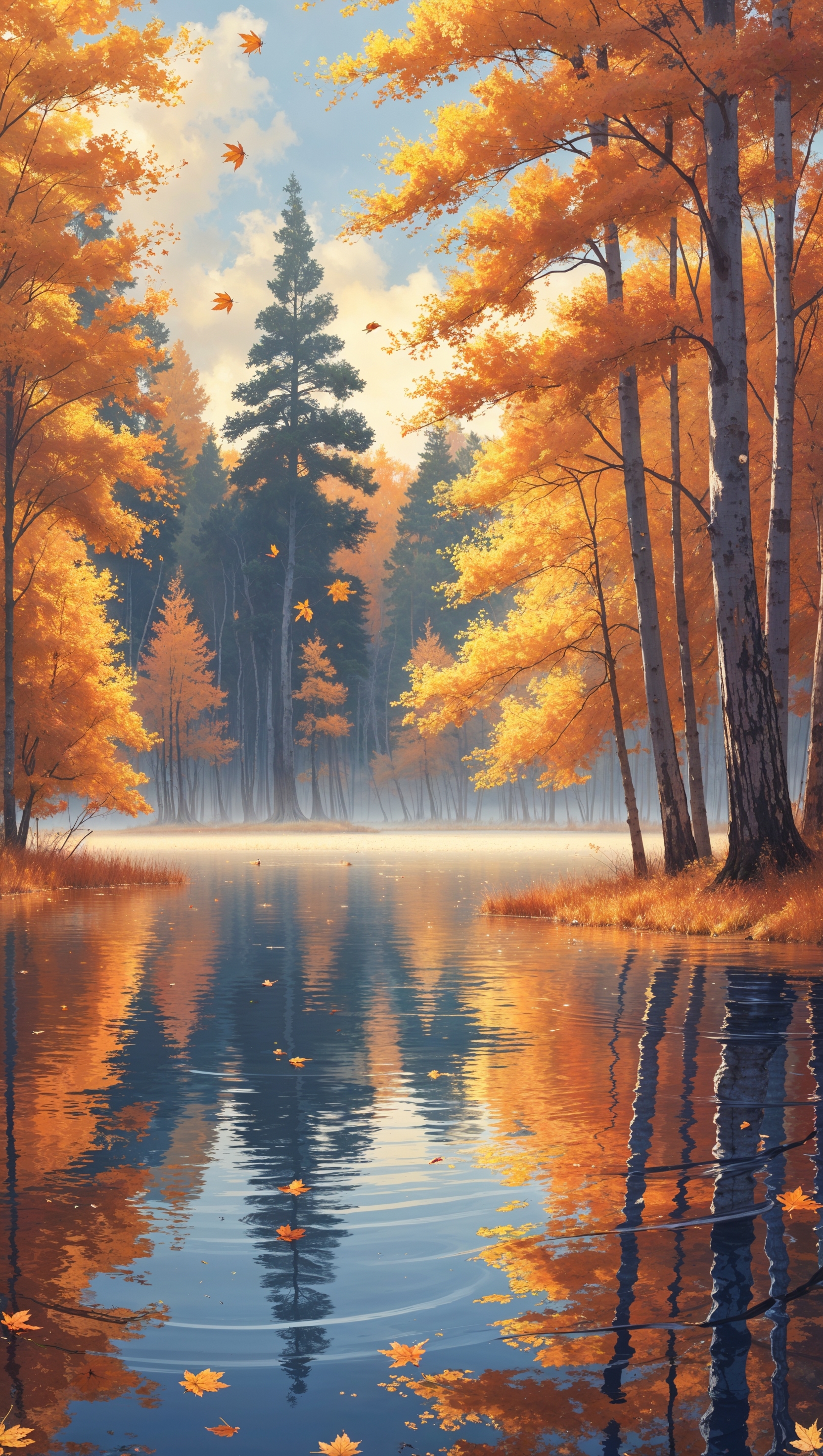 Still lake surrounded by autumn trees with golden leaves 1664x2944 Still lake surrounded by autumn trees with golden leaves
