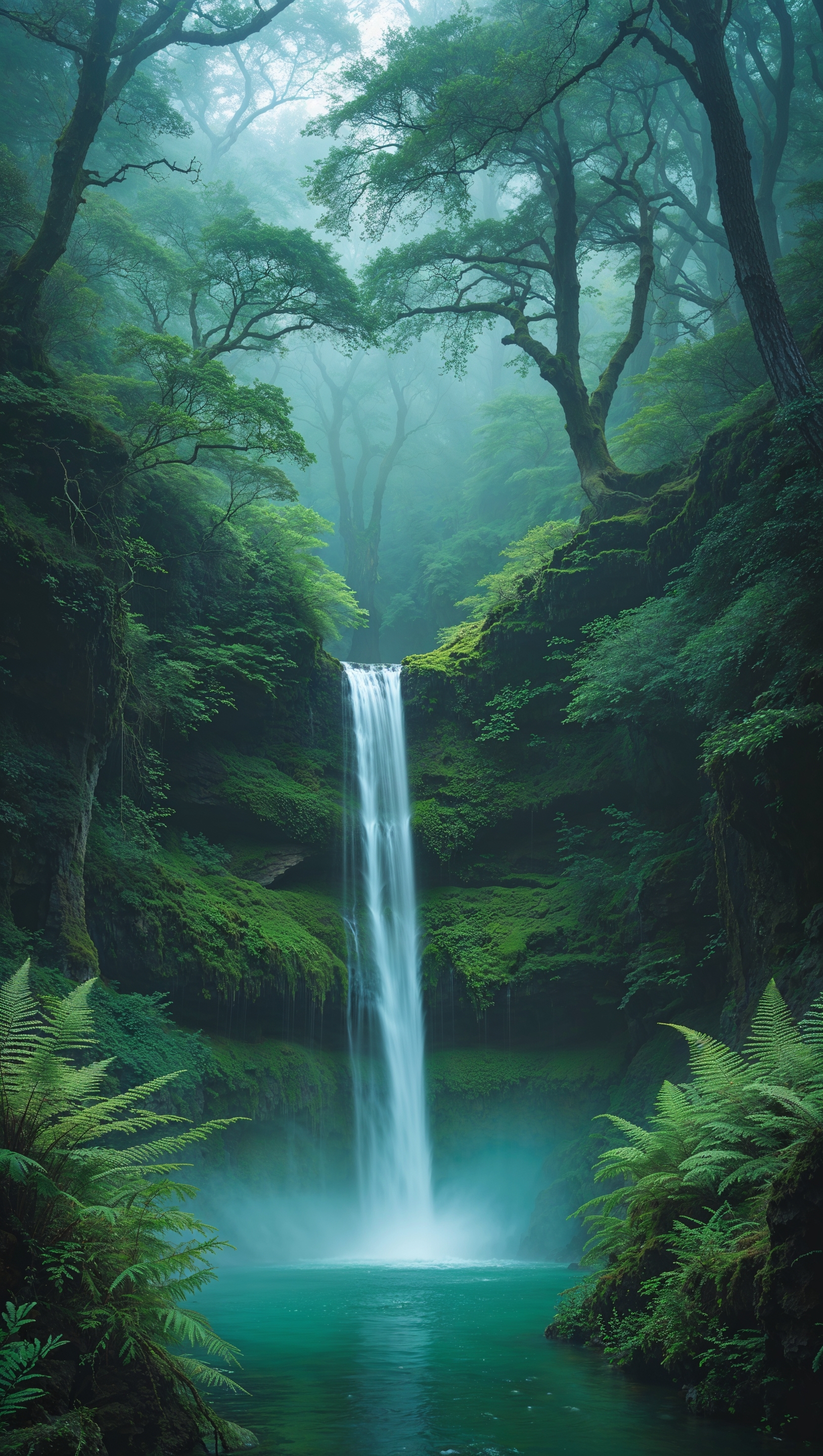 Vertical waterfall flowing gently through lush green forest 1664x2944 Vertical waterfall flowing gently through lush green forest