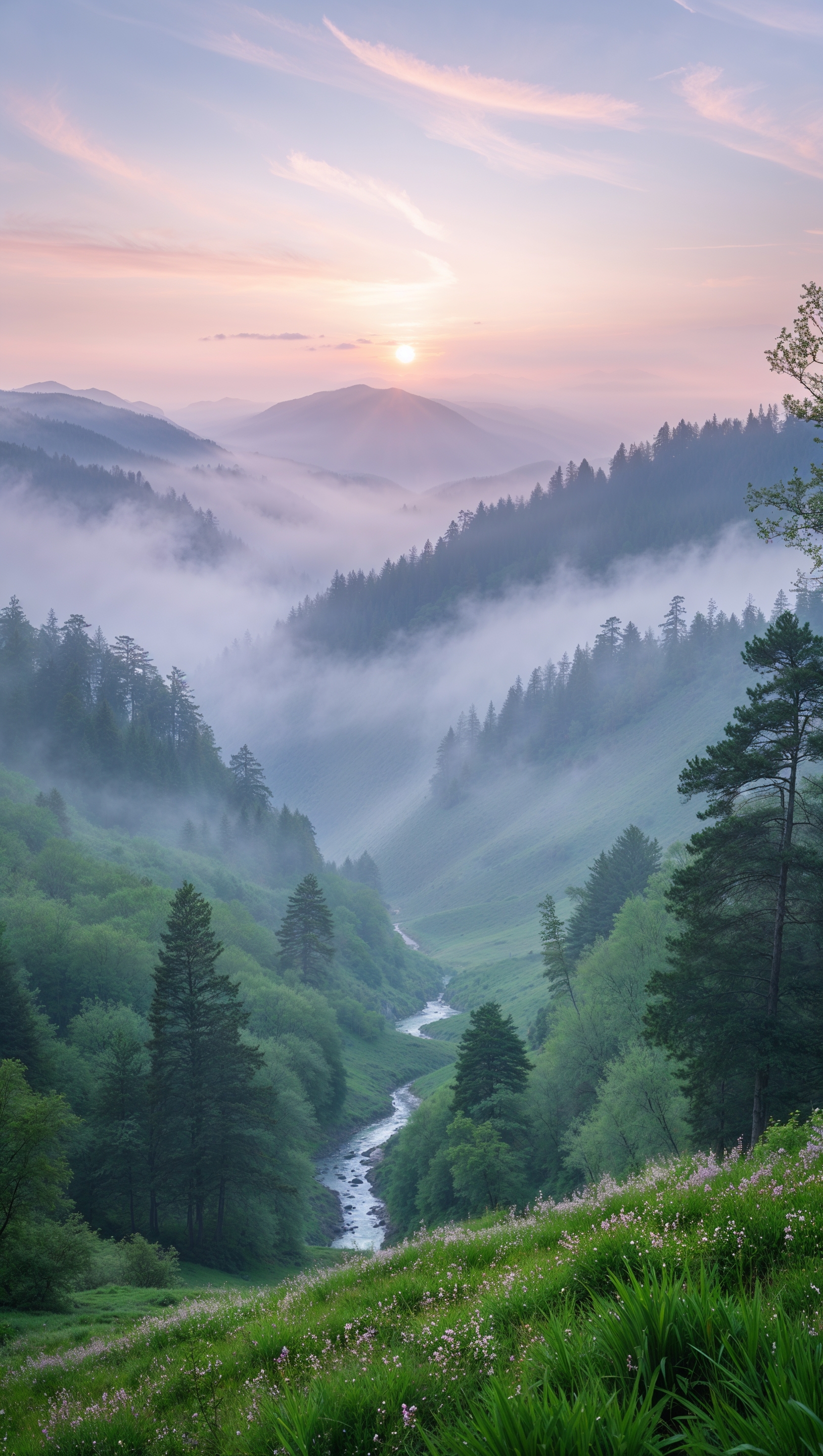 Quiet mountain valley with light fog and soft pastel sky 1664x2944 Quiet mountain valley with light fog and soft pastel sky