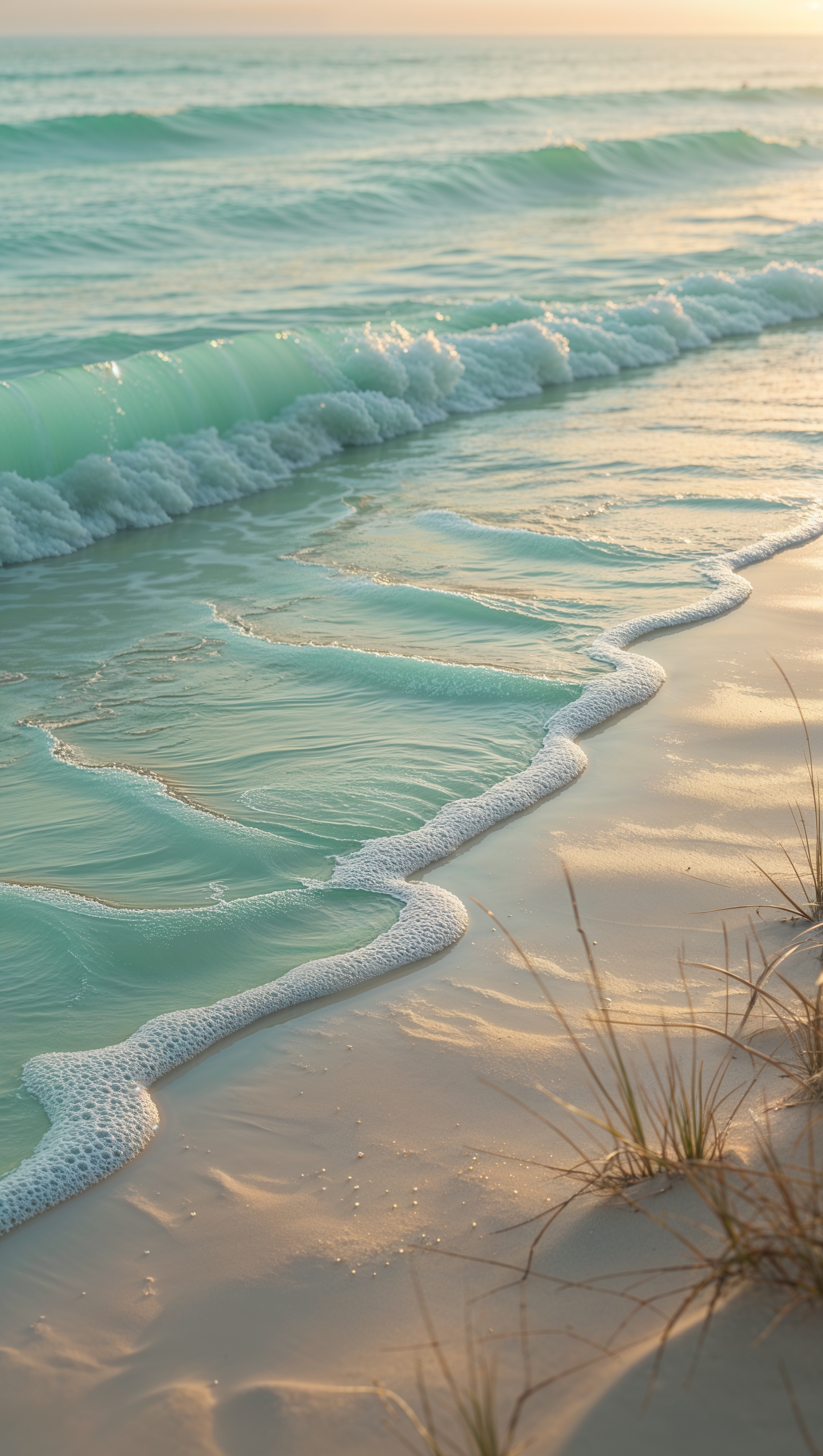 Smooth ocean waves gently lapping on sandy shore at dawn 1664x2944 Smooth ocean waves gently lapping on sandy shore at dawn