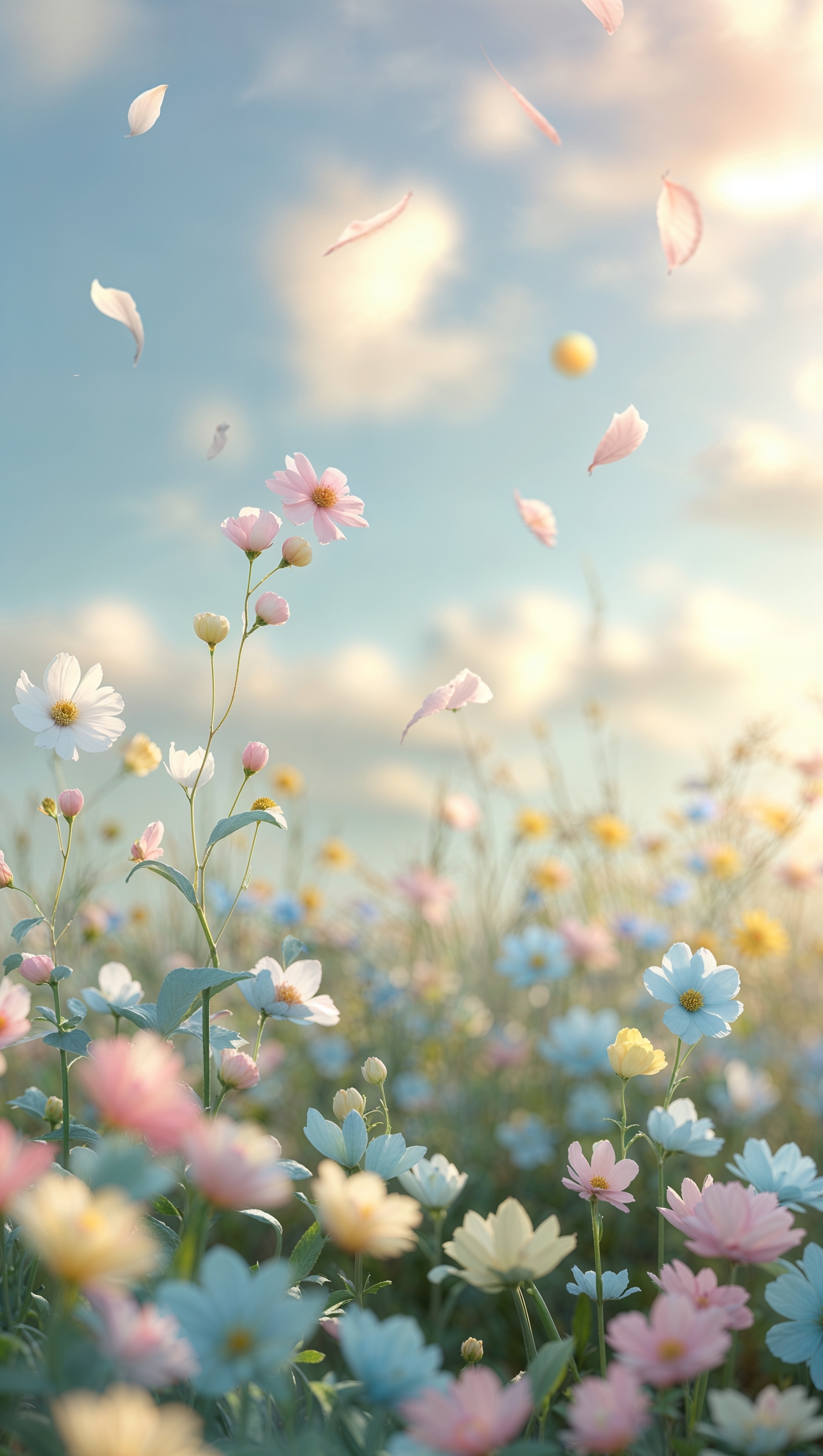 Delicate pastel flower field with soft sunlight, vertical iPhone wallpaper 1664x2944 Delicate pastel flower field with soft sunlight, vertical iPhone wallpaper