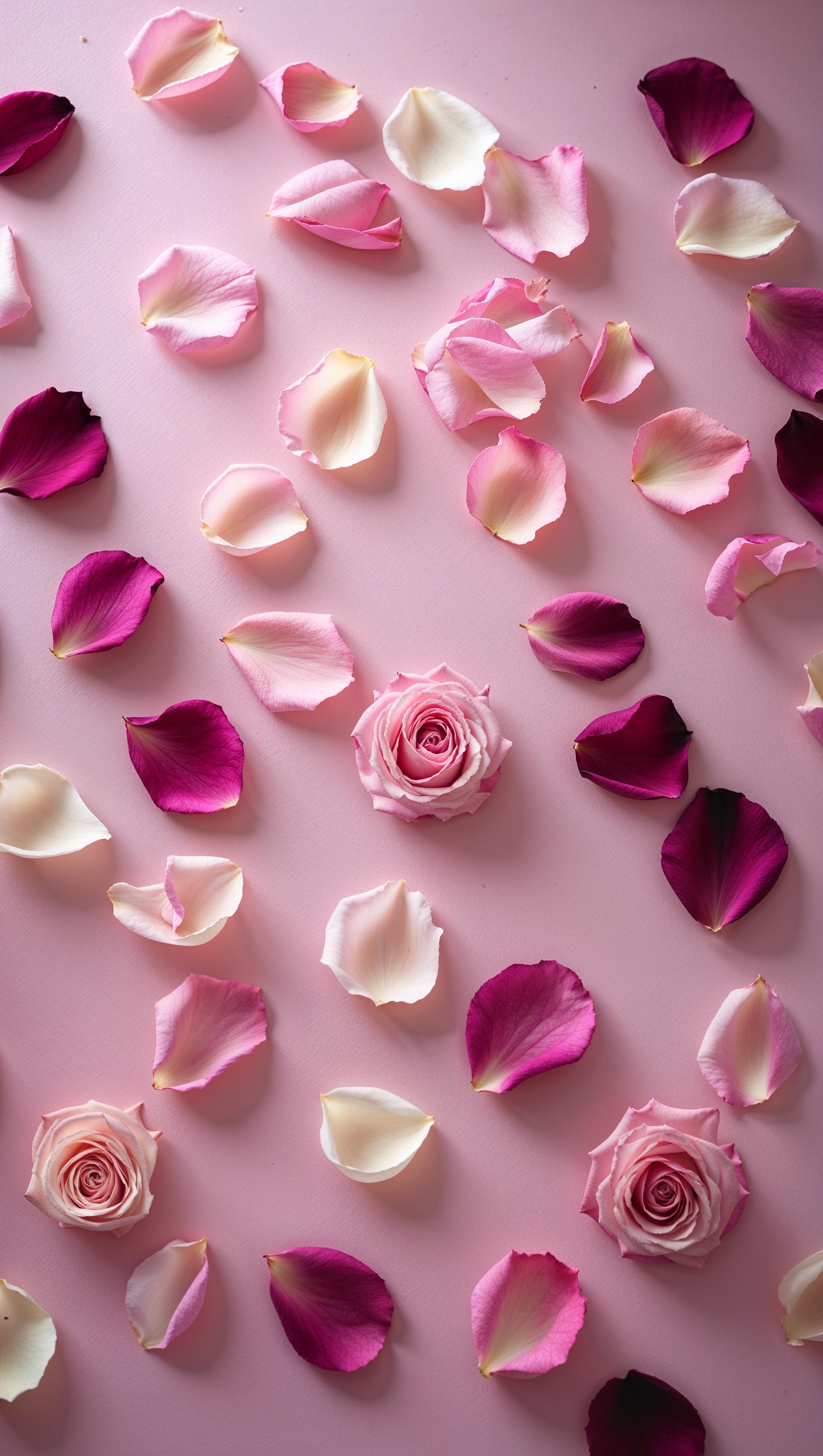 Romantic rose petals scattered on soft pink background, dreamy look 1664x2944 Romantic rose petals scattered on soft pink background, dreamy look