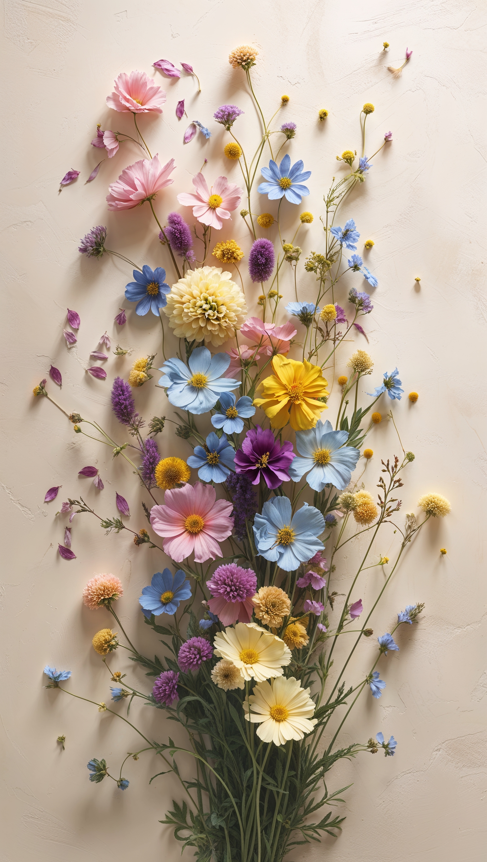 Flat-lay of wildflowers on a cream-colored background, vertical format 1664x2944 Flat-lay of wildflowers on a cream-colored background, vertical format