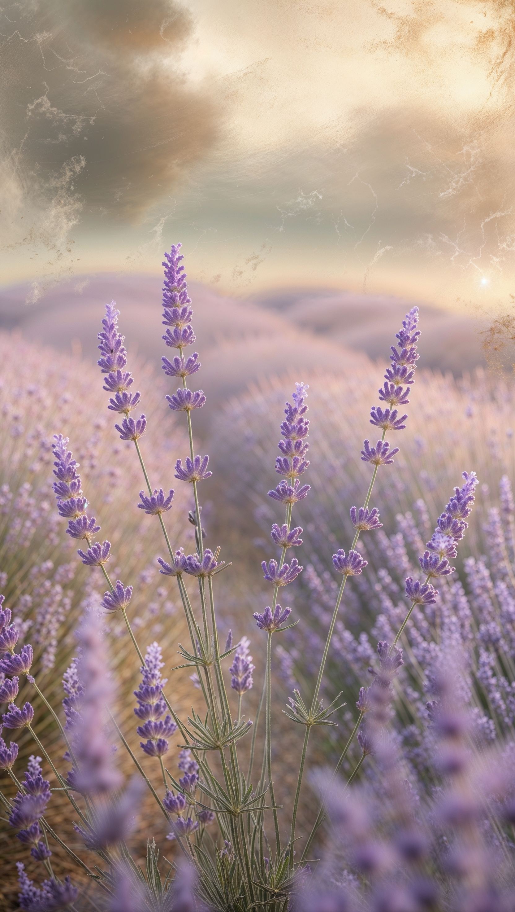 Muted lavender field in soft focus, peaceful and vintage tone 1664x2944 Muted lavender field in soft focus, peaceful and vintage tone