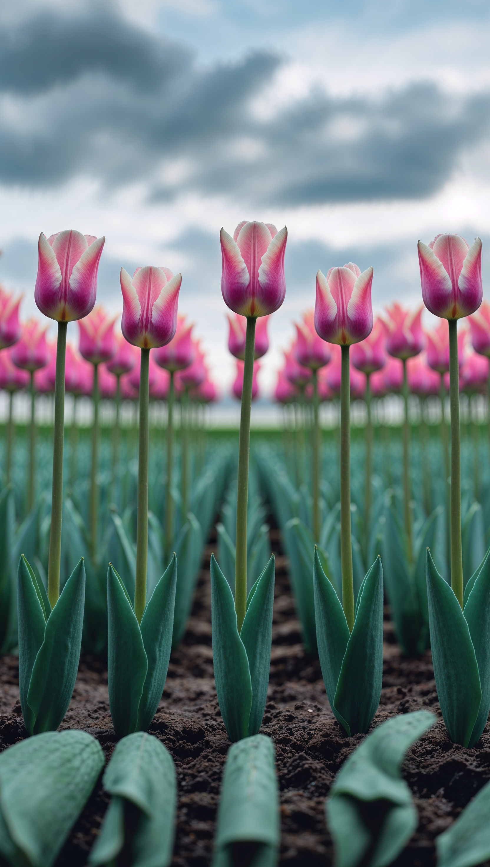 Pink tulips in rows under a cloudy sky, calm and vertical iPhone shot 1664x2944 Pink tulips in rows under a cloudy sky, calm and vertical iPhone shot