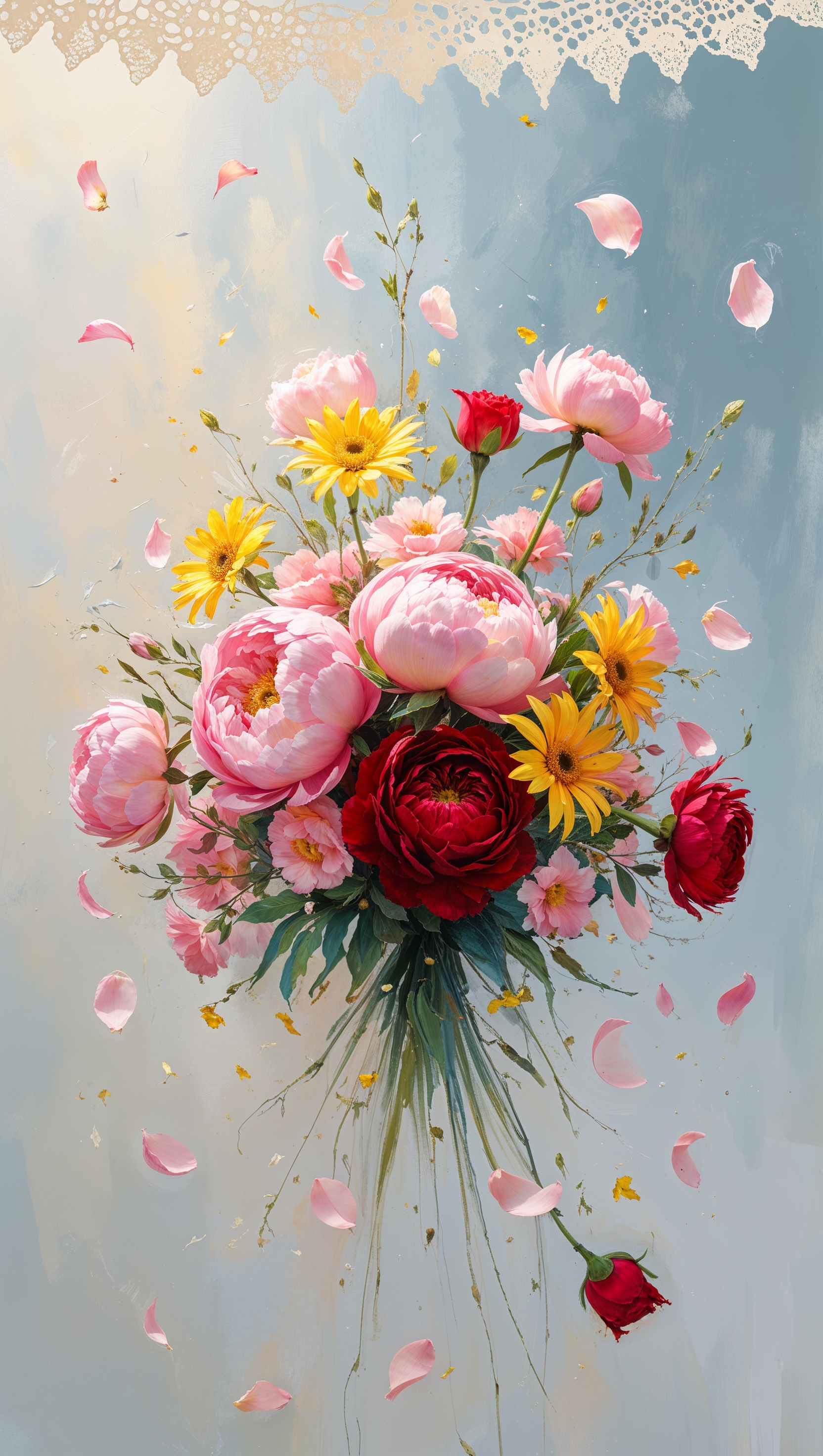 Bouquet of flowers in mid-air with petals falling, artistic concept 1664x2944 Bouquet of flowers in mid-air with petals falling, artistic concept