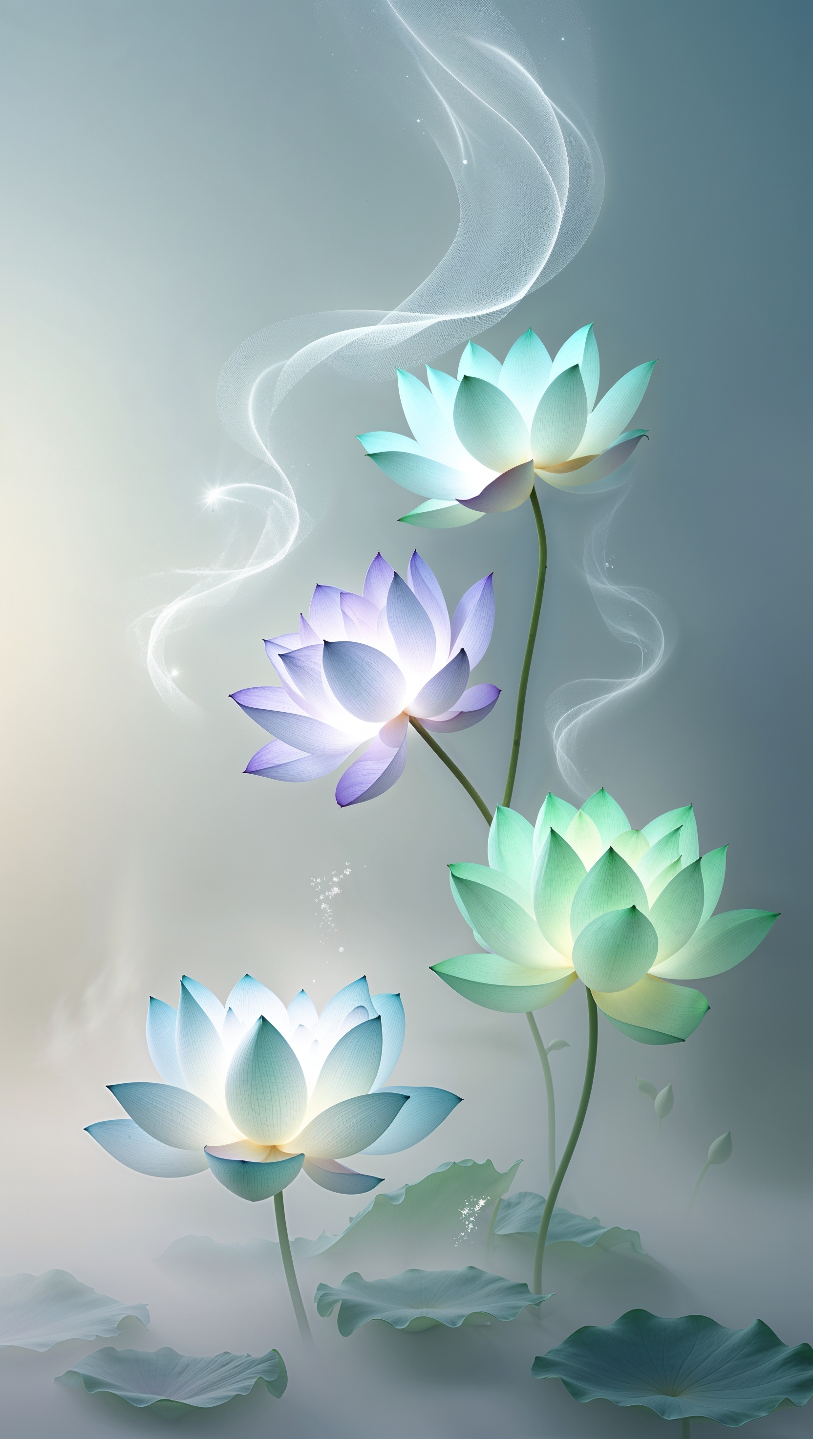 Fantasy glowing lotus flowers floating in mist, mystical wallpaper 1664x2944 Fantasy glowing lotus flowers floating in mist, mystical wallpaper