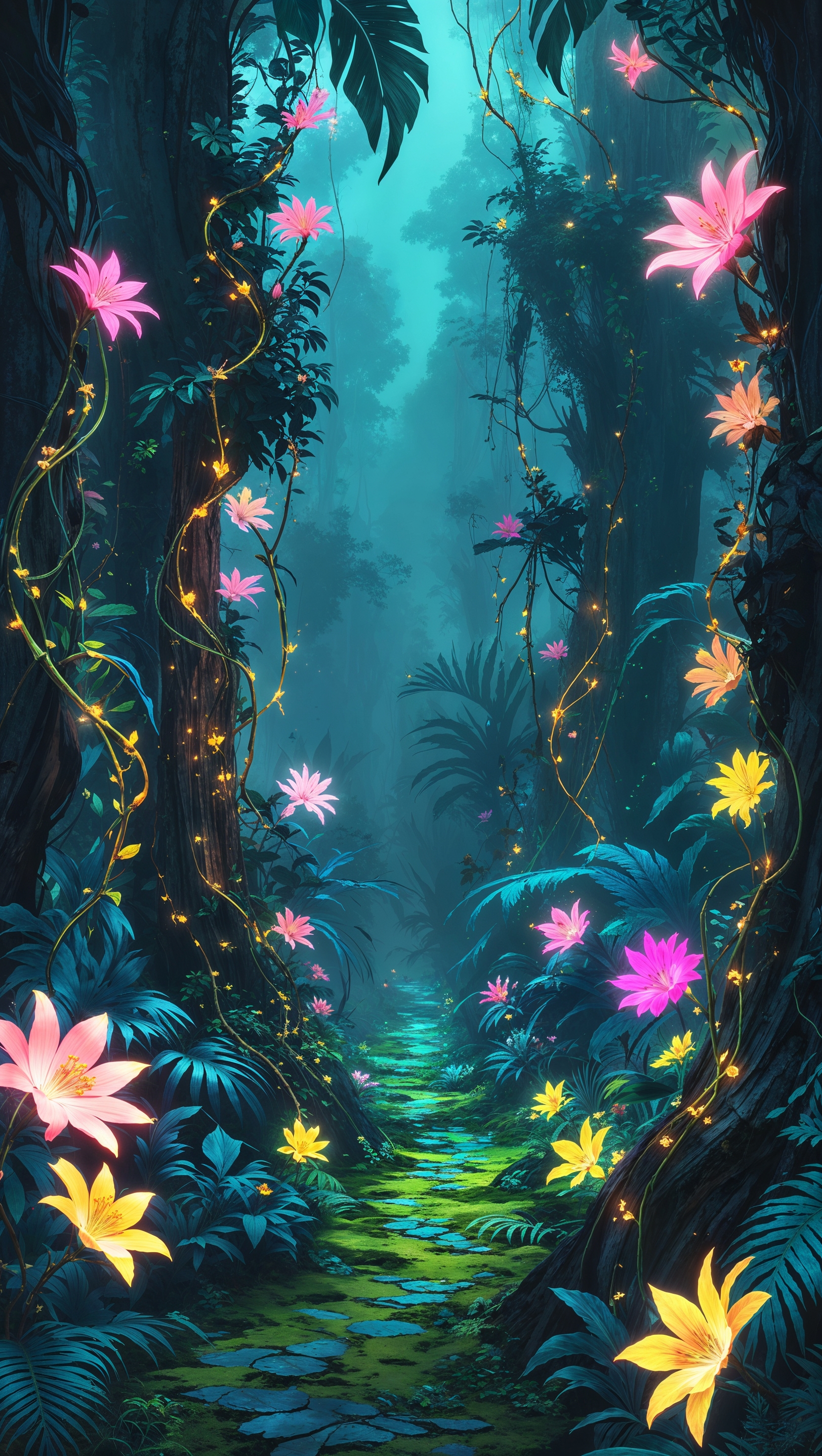 Stylized fantasy jungle with glowing flowers and vines, vertical frame 1664x2944 Stylized fantasy jungle with glowing flowers and vines, vertical frame