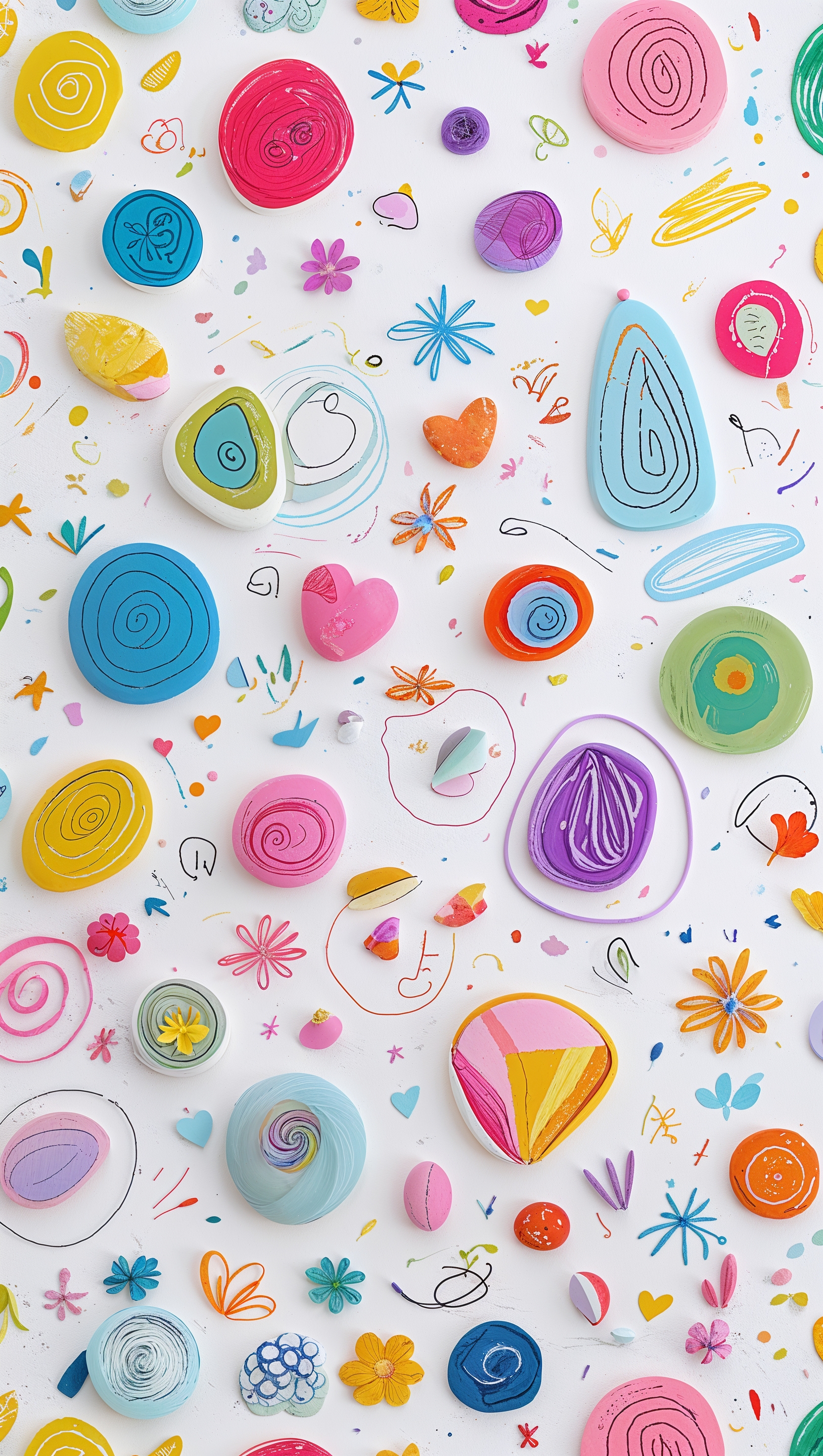 1664x2944 Cute colorful doodles scattered on white background, playful and cheerful