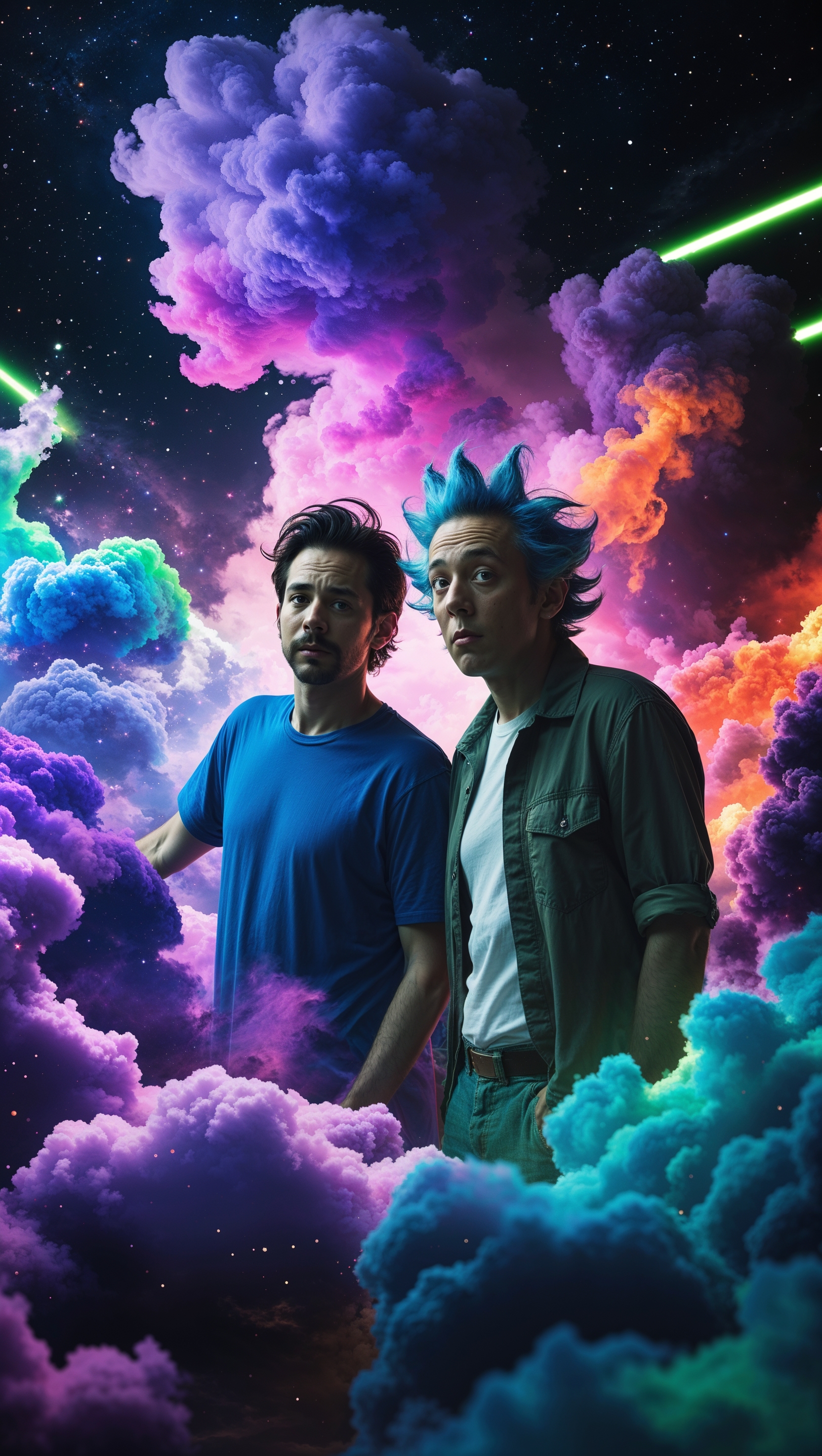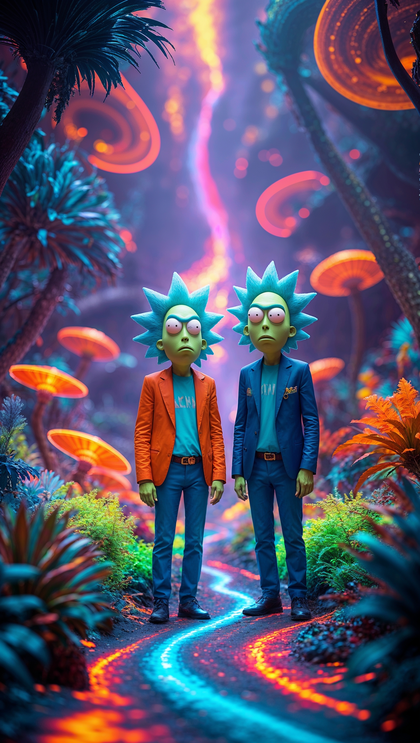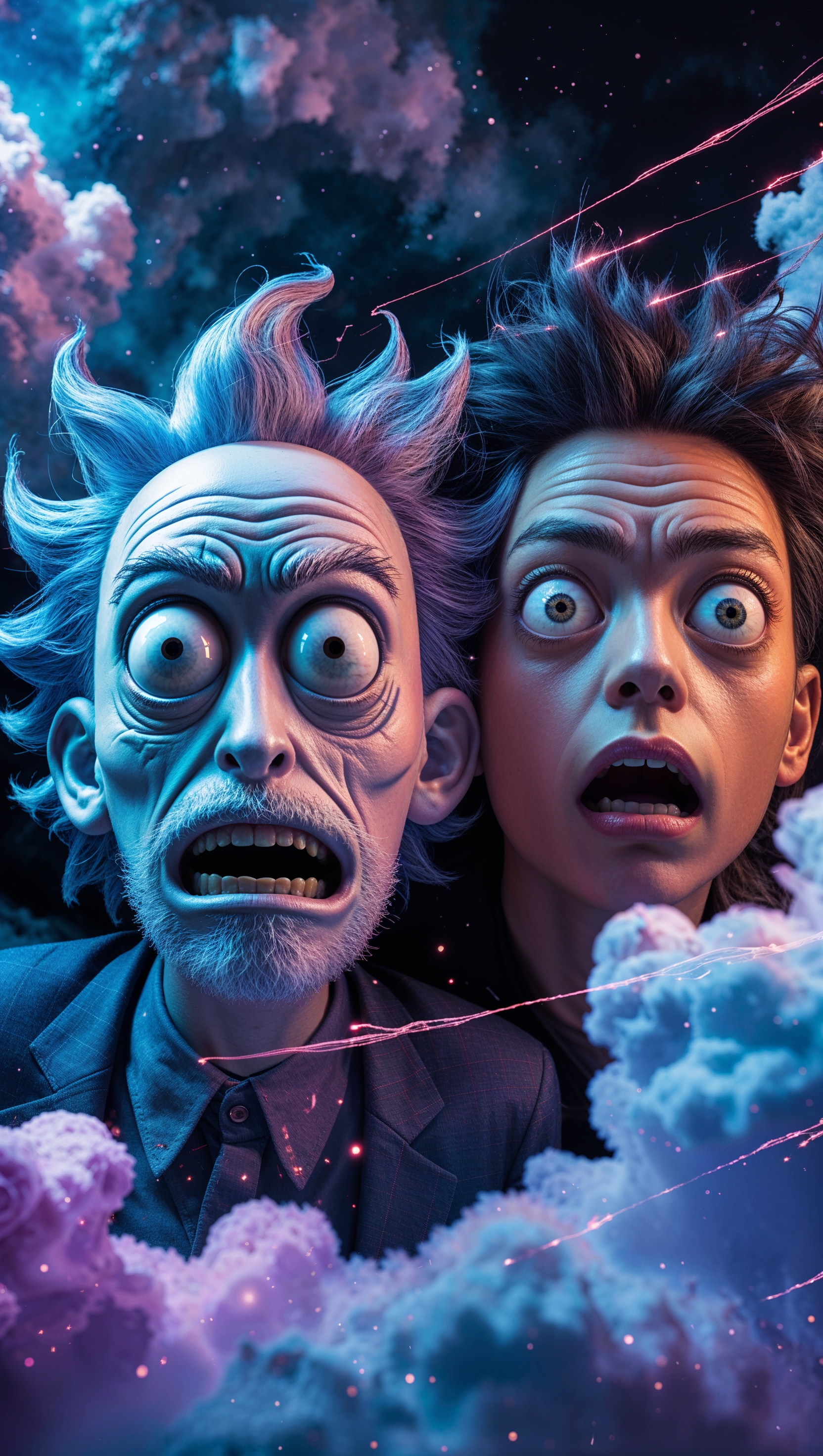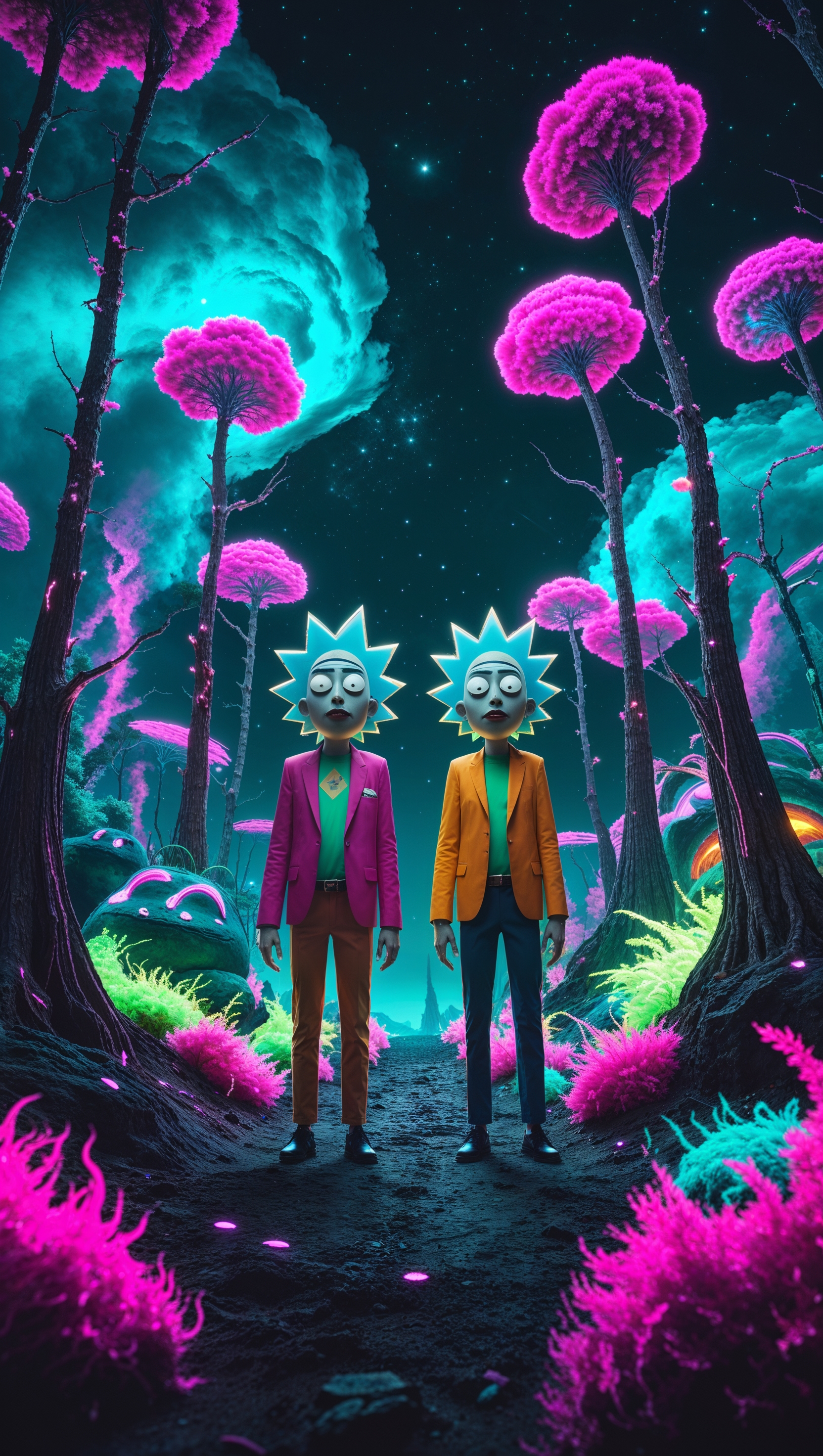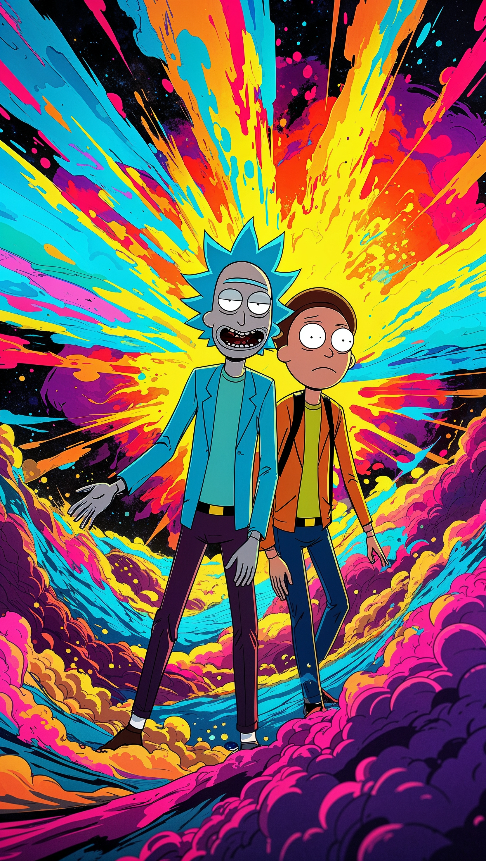 1664x2944 Rick and Morty in an acid-trip world with vivid and weird colors